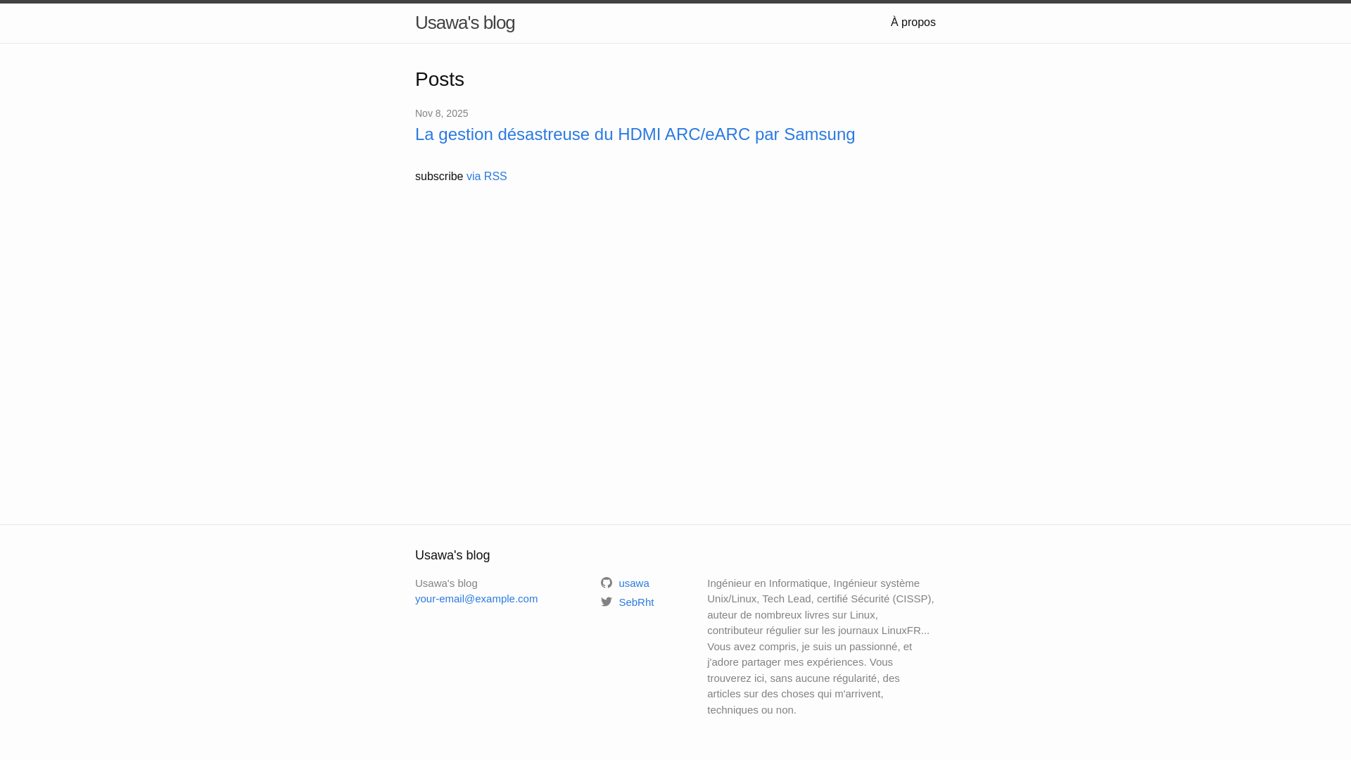 Usawa’s blogIngénieur en Informatique, Ingénieur système Unix/Linux, Tech Lead, certifié Sécurité (CISSP), auteur de nombreux livres sur Linux, contributeur régulier sur les journaux LinuxFR… Vous avez compris, je suis un passionné, et j’adore partager mes expériences. Vous trouverez ici, sans aucune régularité, des articles sur des choses qui m’arrivent, techniques ou non.PNGPDF