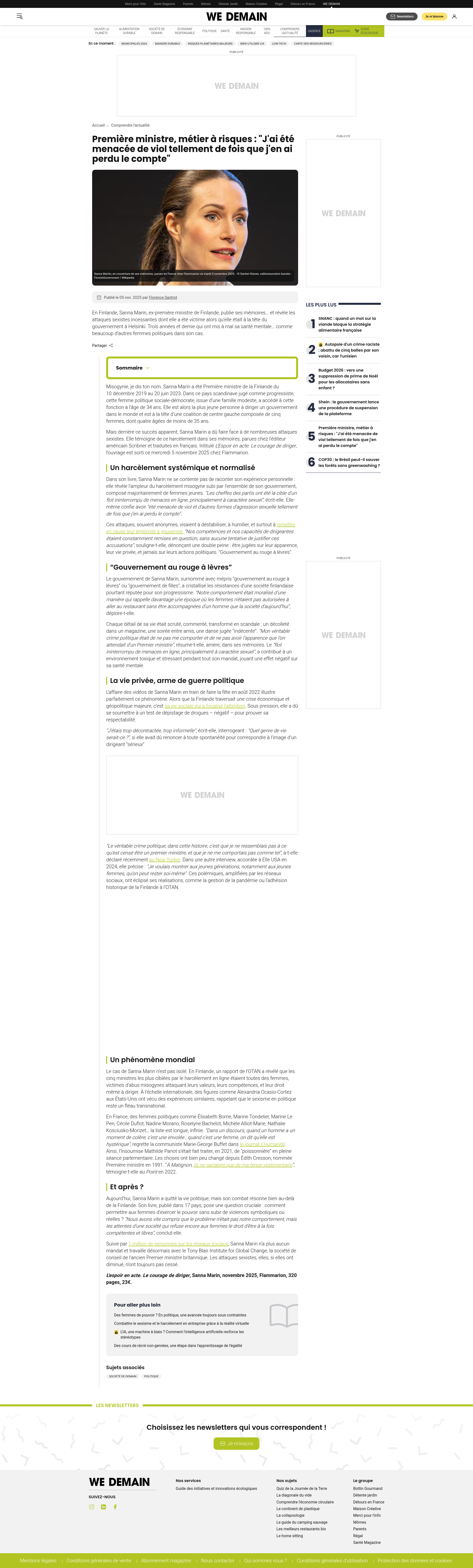 Première ministre, métier à risques : "J'ai été menacée de viol tellement de fois que j'en ai perdu le compte"En Finlande, Sanna Marin, ex-première ministre de Finlande, publie ses mémoires… et révèle les attaques sexistes incessantes dont elle a été victime alors qu’elle était à la tête du gouvernement à Helsinki. Trois années et demie qui ont mis à mal sa santé mentale… comme beaucoup d’autres femmes politiques dans son cas.PNGPDF