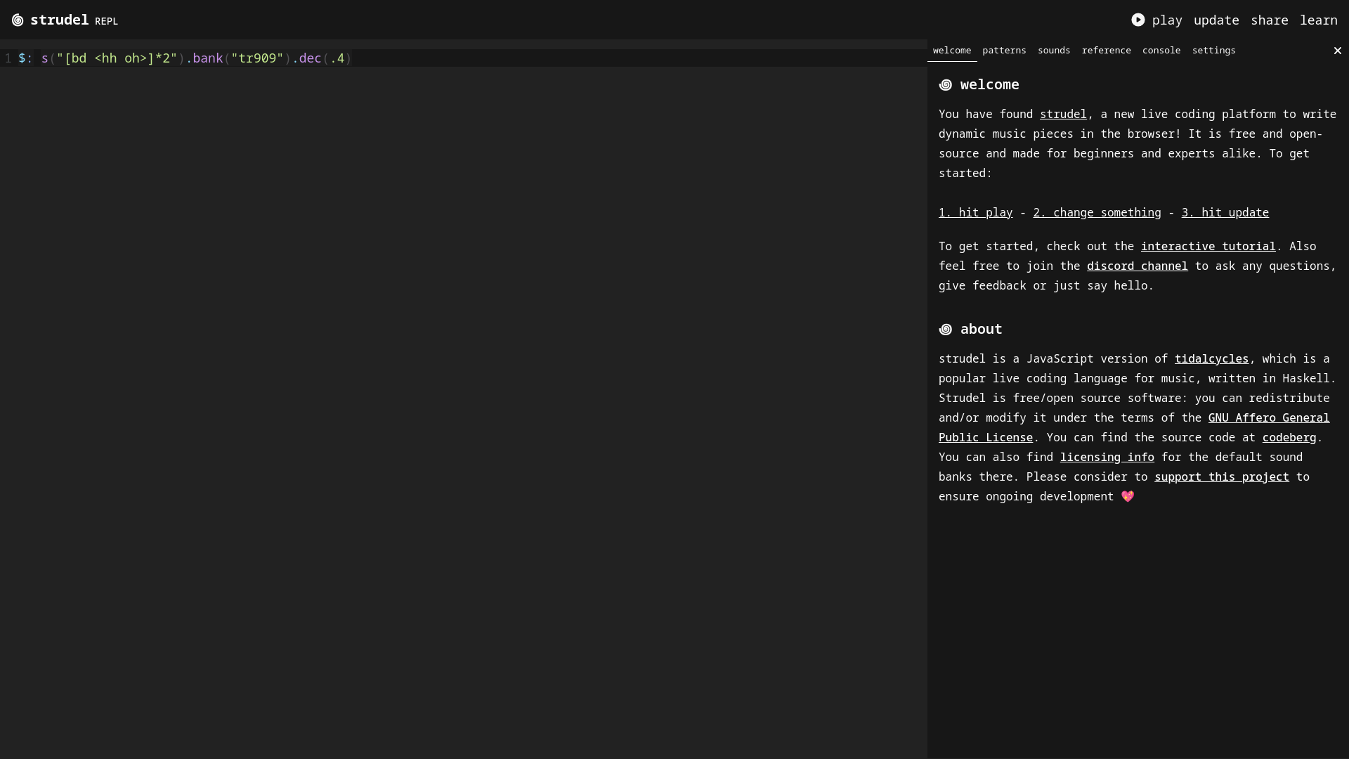 Strudel REPLStrudel is a music live coding environment for the browser, porting the TidalCycles pattern language to JavaScript.PNGPDF