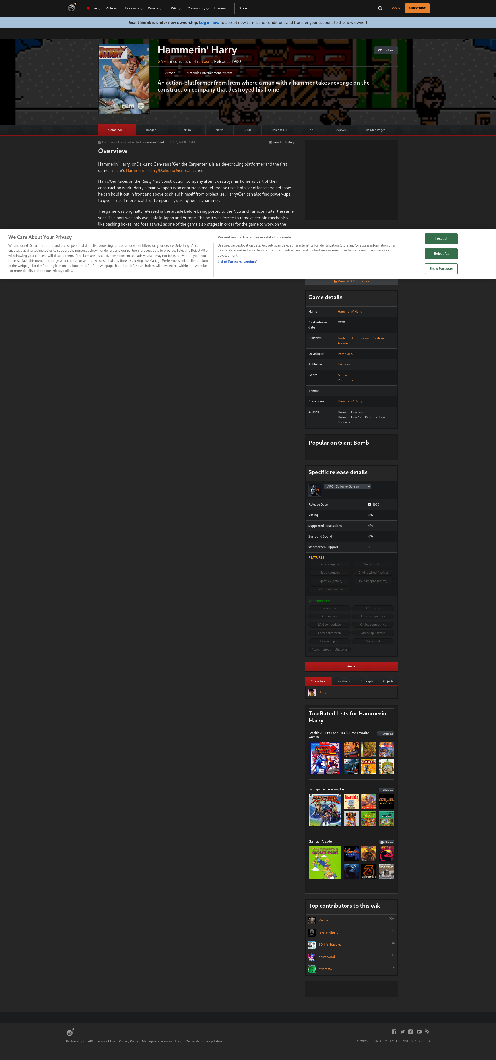 Hammerin' Harry (Game) - Giant Bomb An action-platformer from Irem where a man with a hammer takes revenge on the construction company that destroyed his home.PNGPDF