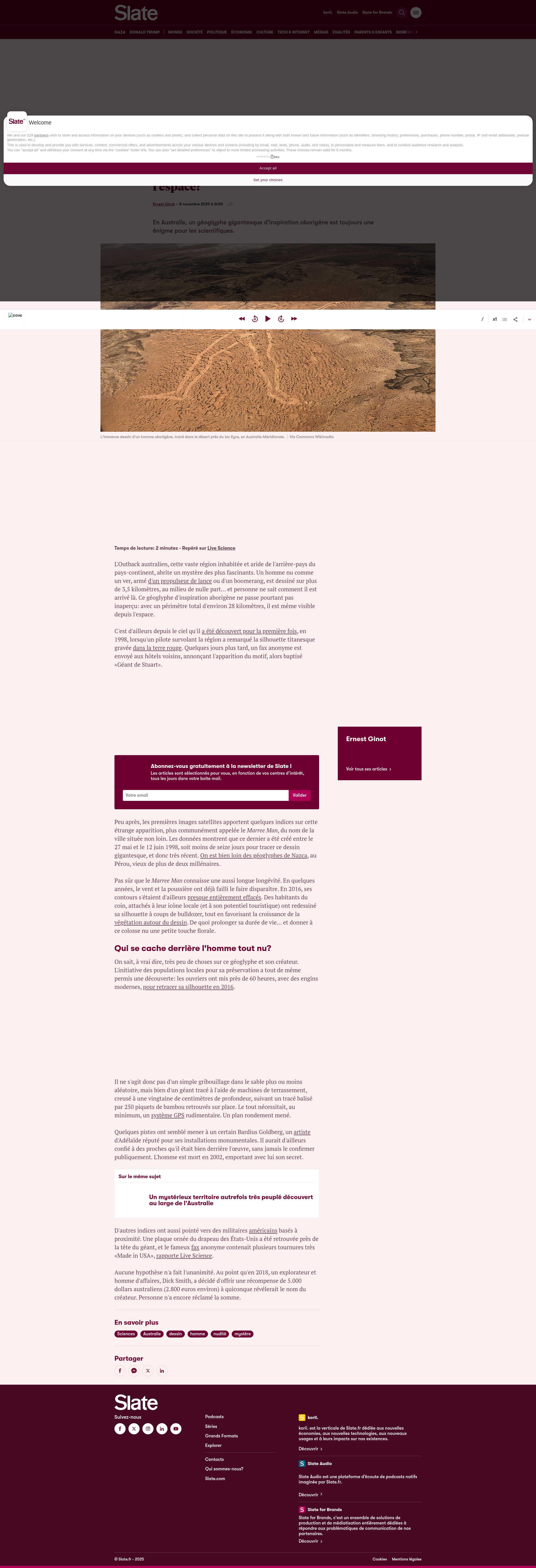 Qui a dessiné le «Marree Man», ce mystérieux homme nu de trois kilomètres de long, visible depuis l'espace?En Australie, un géoglyphe gigantesque d'inspiration aborigène est toujours une énigme pour les scientifiques.PNGPDF