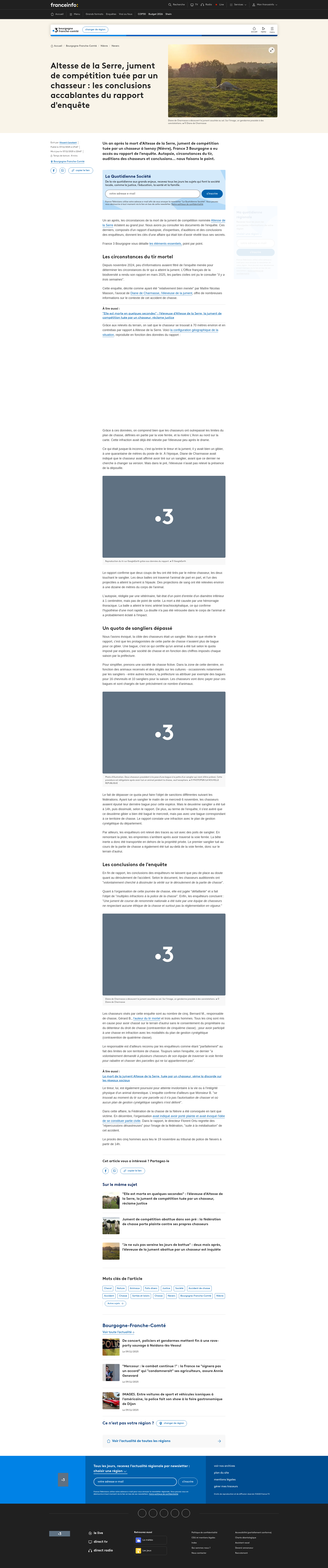 Altesse de la Serre, jument de compétition tuée par un chasseur : les conclusions accablantes du rapport d'enquêteUn an après la mort d'Altesse de la Serre, jument de compétition tuée par un chasseur à Isenay (Nièvre), France 3 Bourgogne a eu accès au rapport de l'enquête. Autopsie, circonstances du tir, auditions des chasseurs et conclusions......PNGPDF