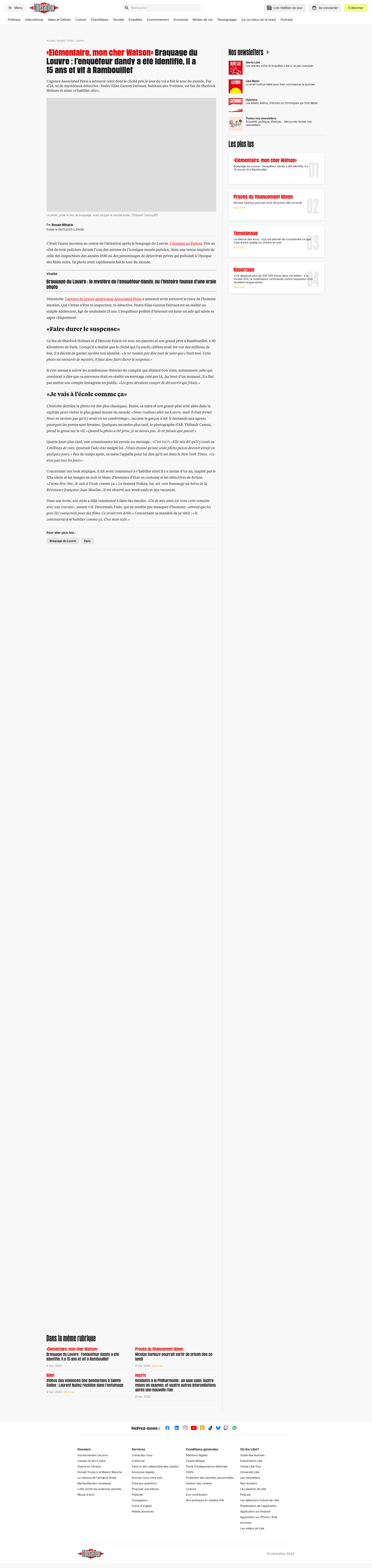 Braquage du Louvre : l’enquêteur dandy a été identifié, il a 15 ans et vit à RambouilletL’agence Associated Press a retrouvé celui dont le cliché pris le jour du vol a fait le tour du monde. Pas d’IA, ni de mystéreux détective : Pedro Elias Garzon Delvaux est fan d’Hercule Poirot et aime «s’habiller chic».PNGPDF