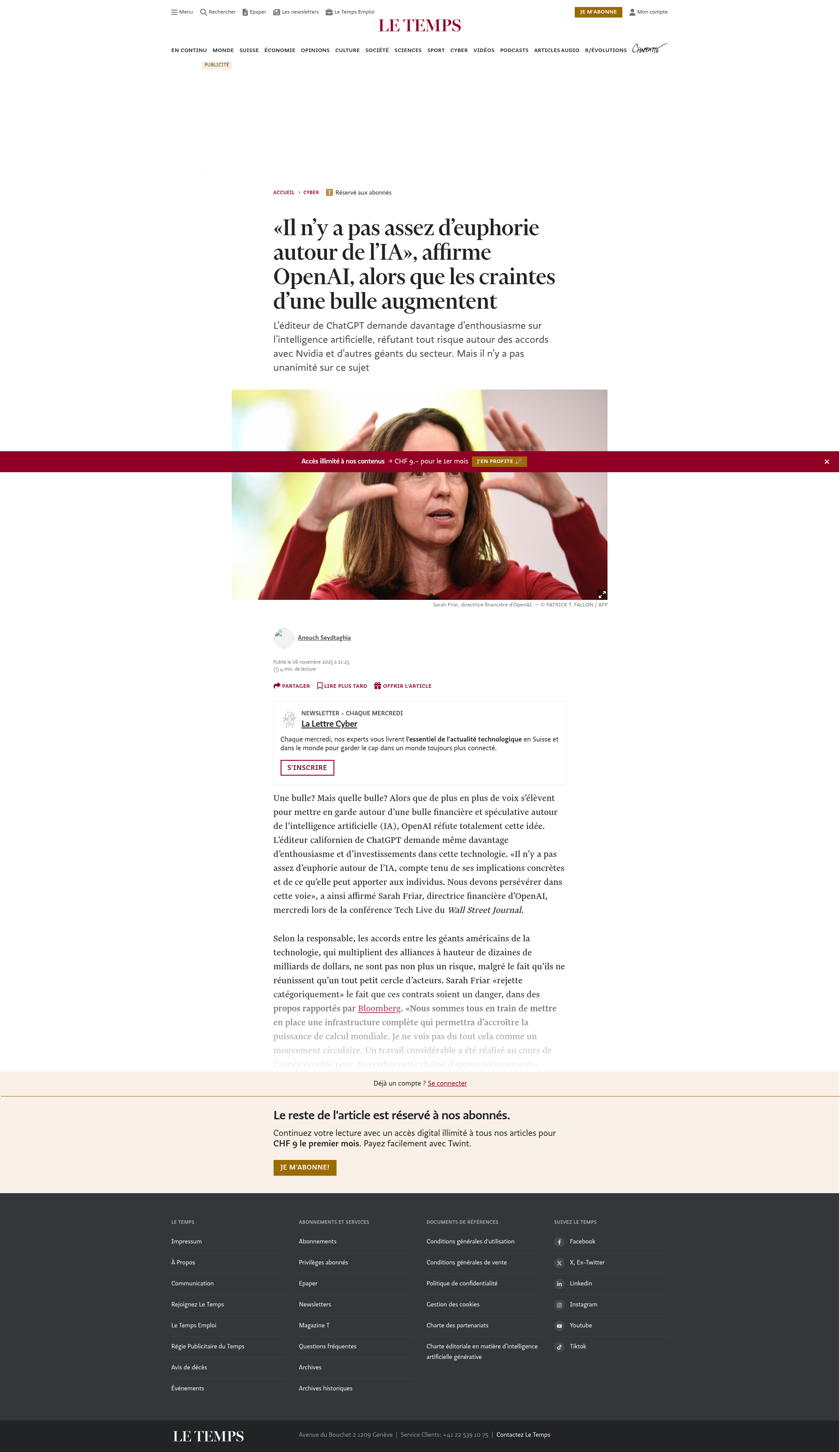 «Il n’y a pas assez d’euphorie autour de l’IA», affirme OpenAI, alors que les craintes d’une bulle augmentent - Le TempsL’éditeur de ChatGPT demande davantage d’enthousiasme sur l’intelligence artificielle, réfutant tout risque autour des accords avec Nvidia et d’autres géants du secteur. Mais il n’y a pas unanimité sur ce sujetPNGPDF