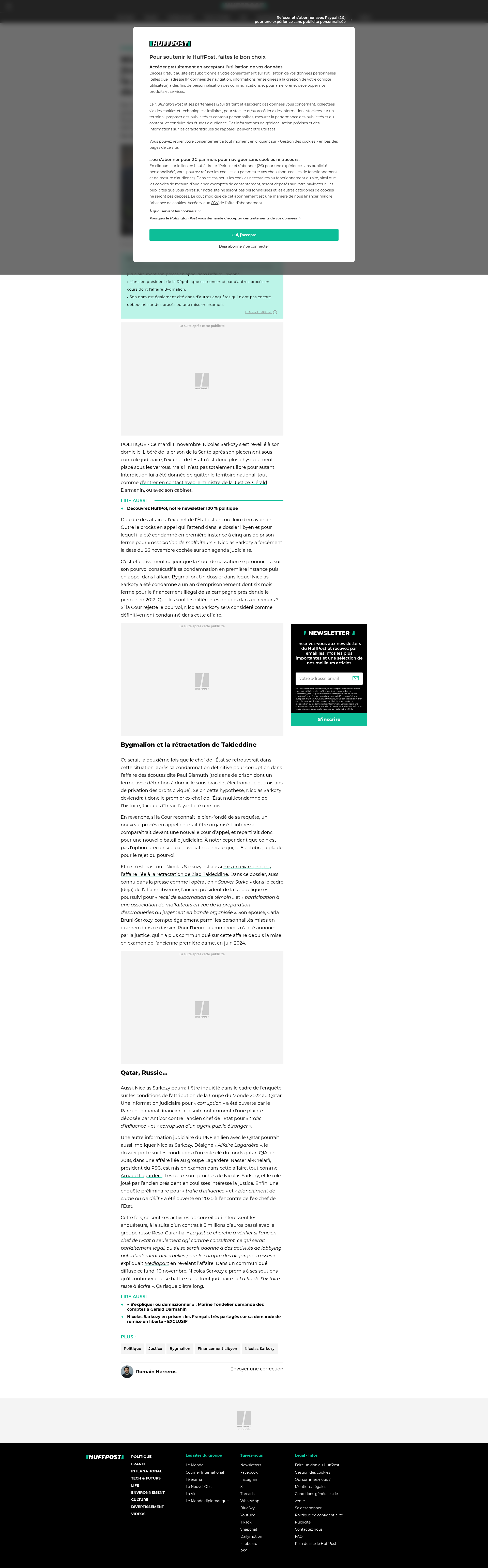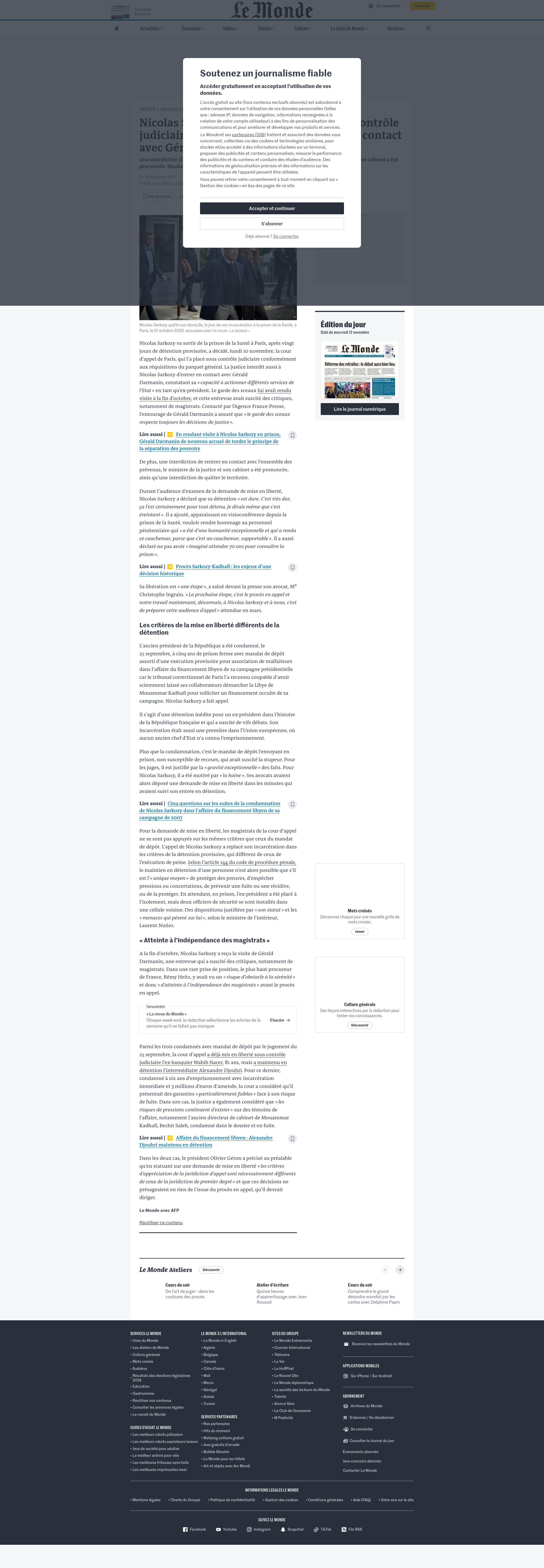 Nicolas Sarkozy va sortir de prison sous contrôle judiciaire, la cour d’appel lui interdit tout contact avec Gérald DarmaninUne interdiction d’entrer en contact avec l’ensemble des prévenus, le ministre de la justice et son cabinet a été prononcée. Nicolas Sarkozy est par ailleurs interdit de quitter le territoire.PNGPDF