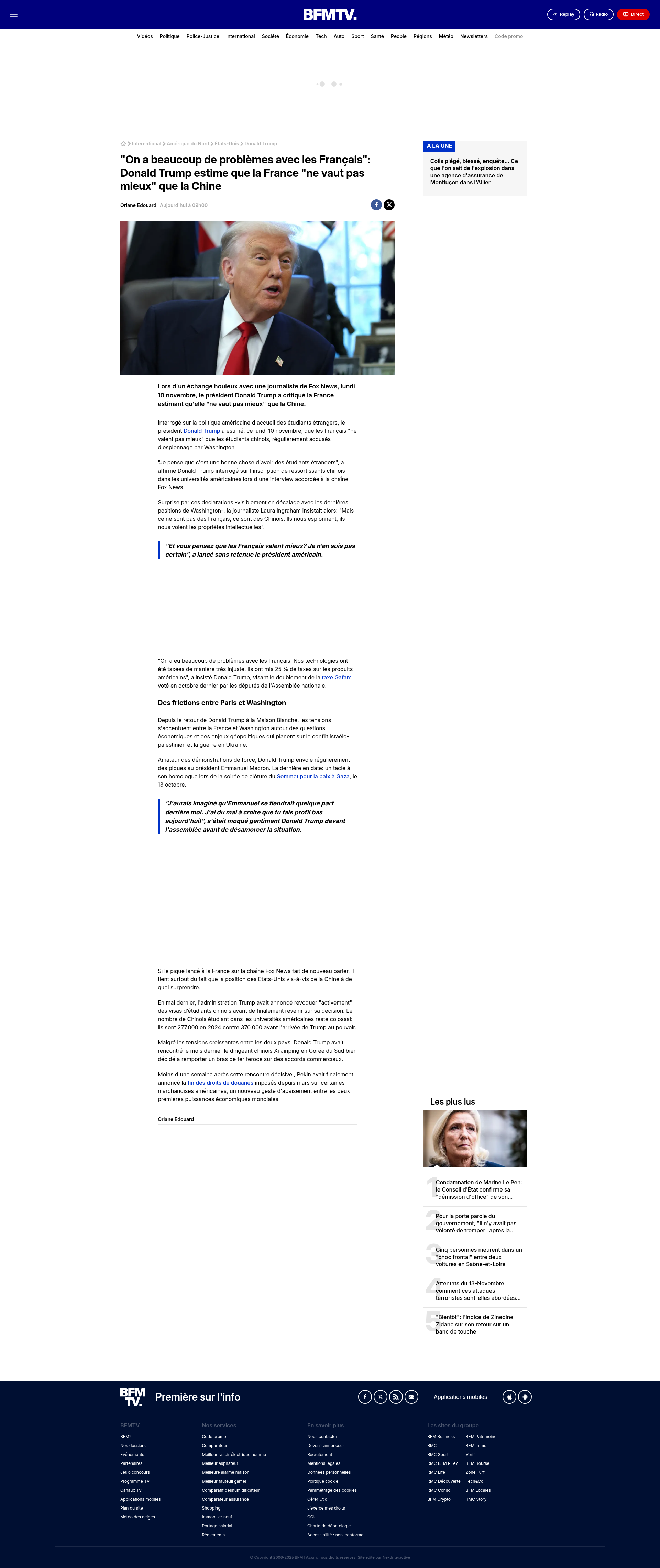 "On a beaucoup de problèmes avec les Français": Donald Trump estime que la France "ne vaut pas mieux" que la ChineLors d'un échange houleux avec une journaliste de Fox News, lundi 10 novembre, le président Donald Trump a critiqué la France estimant qu'elle "ne vaut pas mieux" que la Chine. PNGPDF