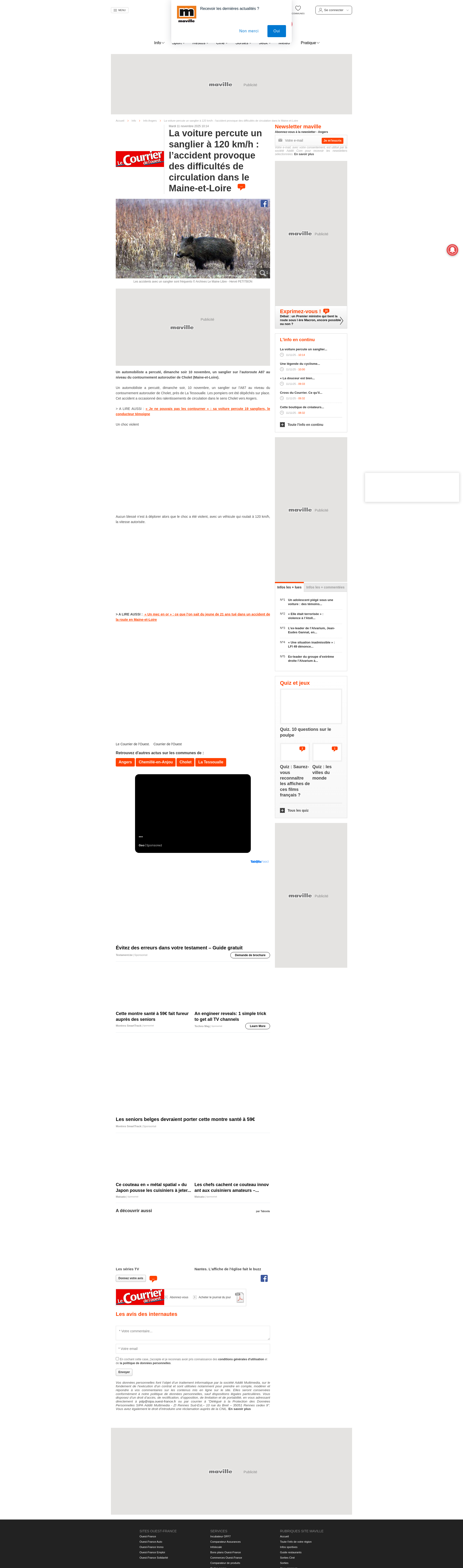 La voiture percute un sanglier à 120 km/h : l’accident provoque des difficultés de circulationInfo Angers La voiture percute un sanglier à 120 km/h laccident provoque des difficultés de... AngersPNGPDF