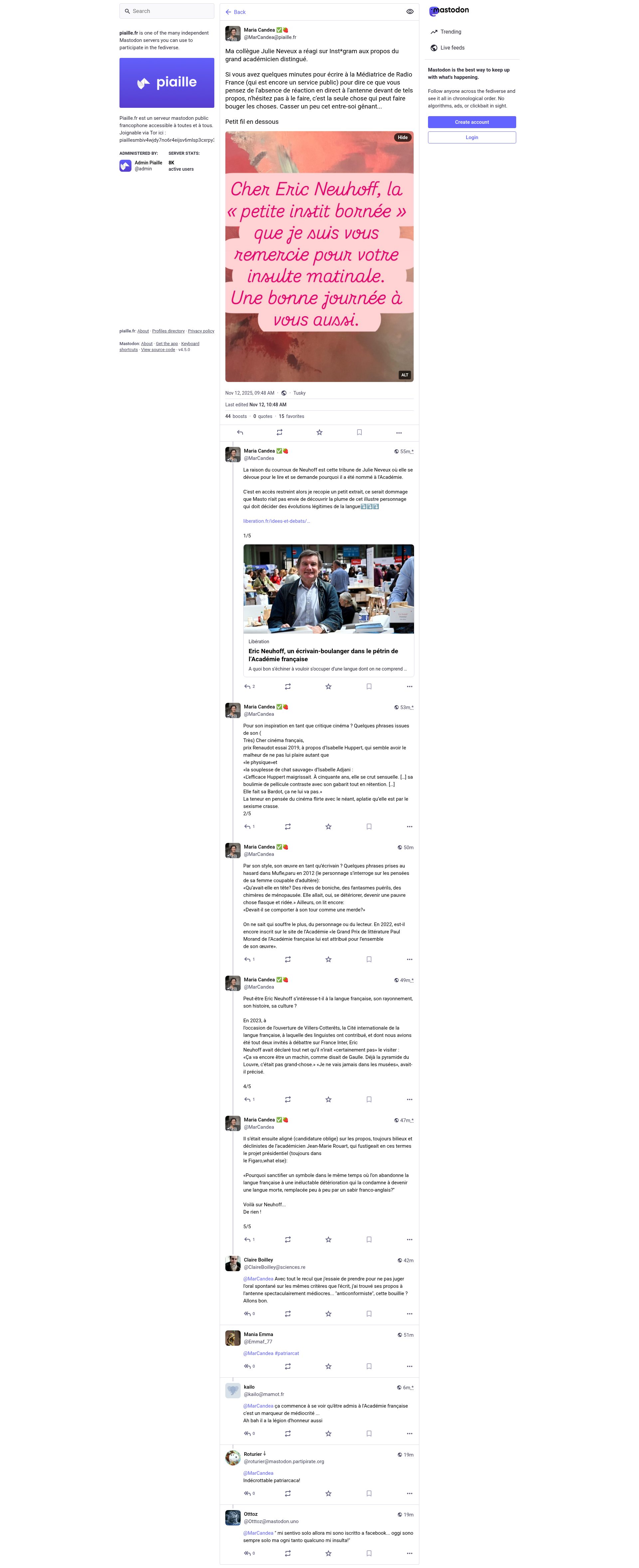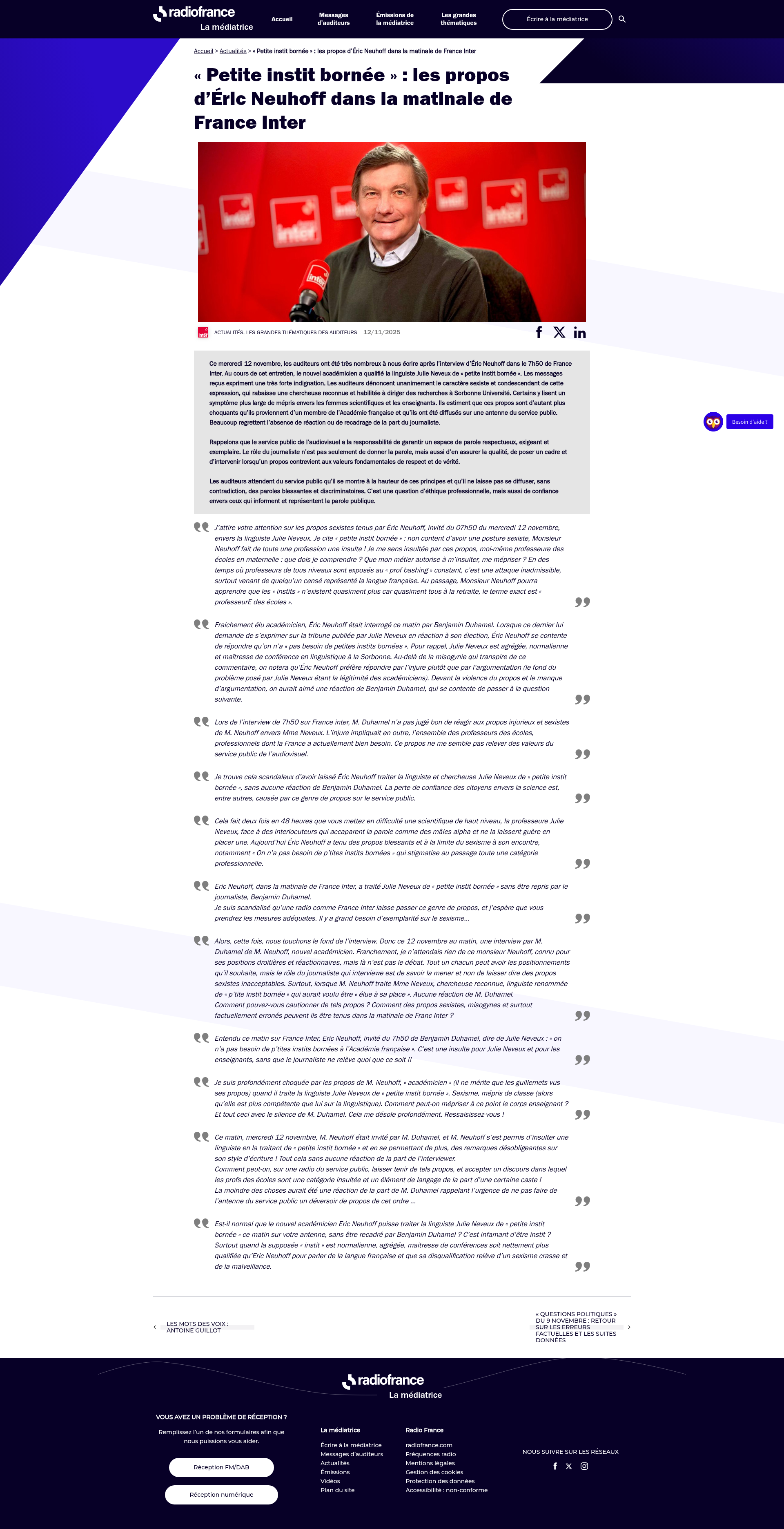 Maria Candea ✅🍓 (@MarCandea@piaille.fr)Attaché : 1 image Ma collègue Julie Neveux a réagi sur Inst*gram aux propos du grand académicien distingué. Si vous avez quelques minutes pour écrire à la Médiatrice de Radio France (qui est encore un service public) pour dire ce que vous pensez de l'absence de réaction en direct à l'antenne devant de tels propos, n'hésitez pas à le faire, c'est la seule chose qui peut faire bouger les choses. Casser un peu cet entre-soi gênant... Petit fil en dessousPNGPDF