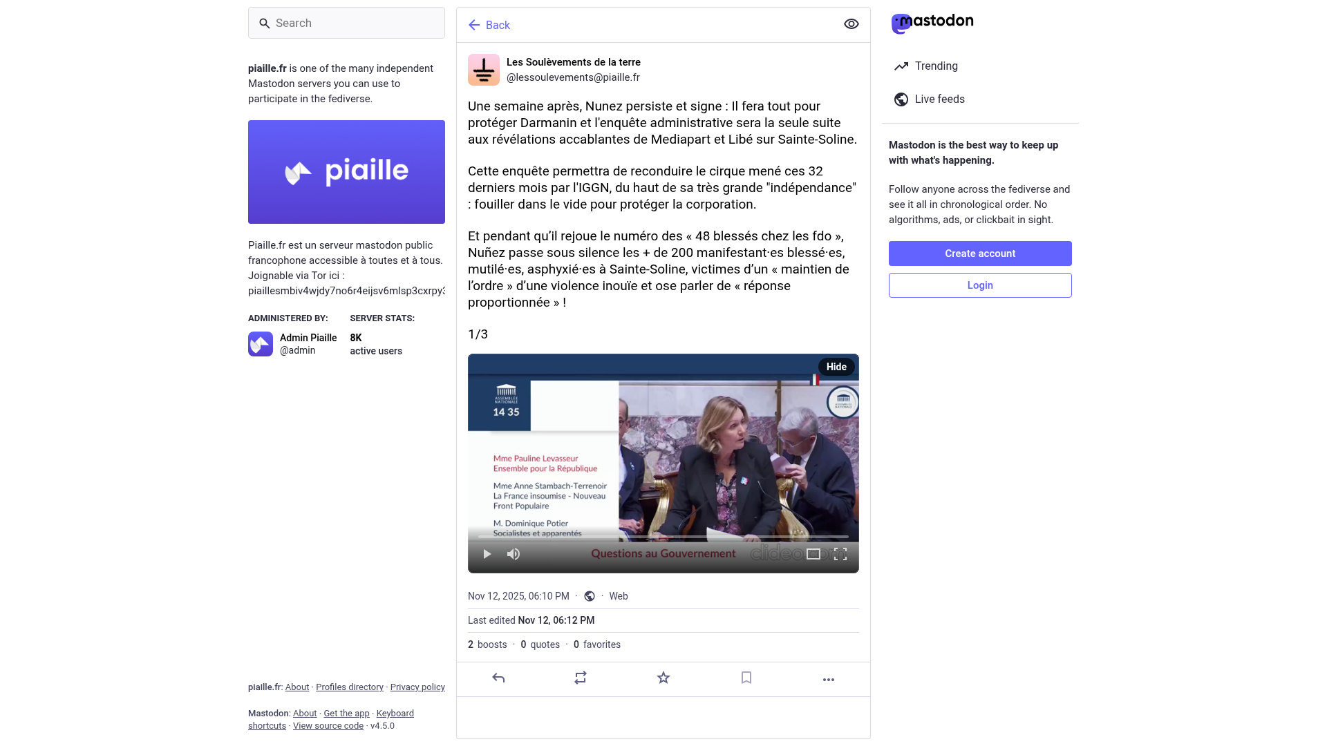 Les Soulèvements de la terre (@lessoulevements@piaille.fr)Attaché : 1 vidéo Une semaine après, Nunez persiste et signe : Il fera tout pour protéger Darmanin et l'enquête administrative sera la seule suite aux révélations accablantes de Mediapart et Libé sur Sainte-Soline. Cette enquête permettra de reconduire le cirque mené ces 32 derniers mois par l'IGGN, du haut de sa très grande "indépendance" : fouiller dans le vide pour protéger la corporation. Et pendant qu’il rejoue le numéro des « 48 blessés chez les fdo », Nuñez passe sous silence les + de 200 manifestant·es blessé·es, mutilé·es, asphyxié·es à Sainte-Soline, victimes d’un « maintien de l’ordre » d’une violence inouïe et ose parler de « réponse proportionnée » ! 1/3PNGPDF