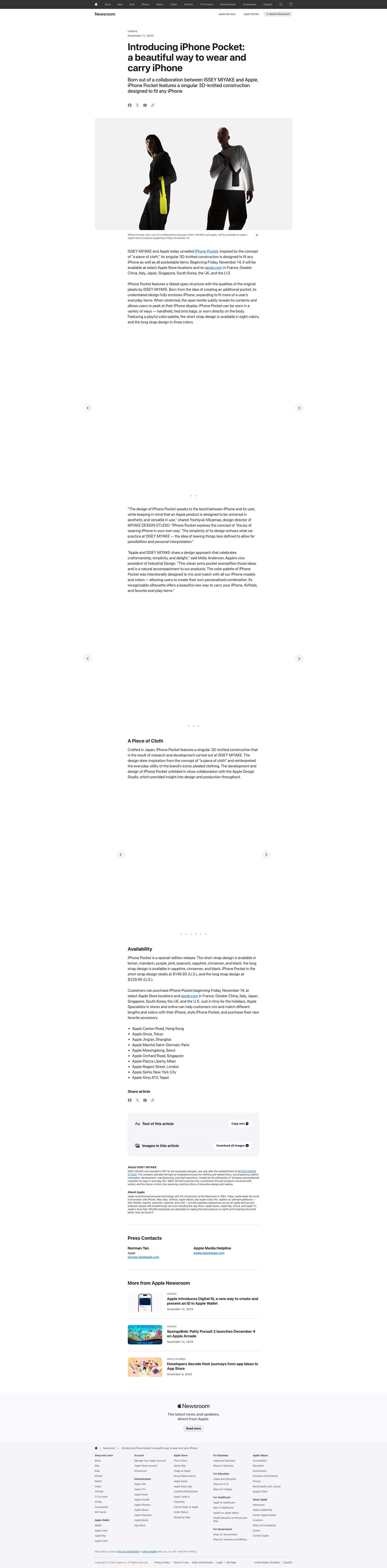 Introducing iPhone Pocket: a beautiful way to wear and carry iPhoneISSEY MIYAKE and Apple today unveiled iPhone Pocket, designed to fit any iPhone as well as all pocketable items.PNGPDF