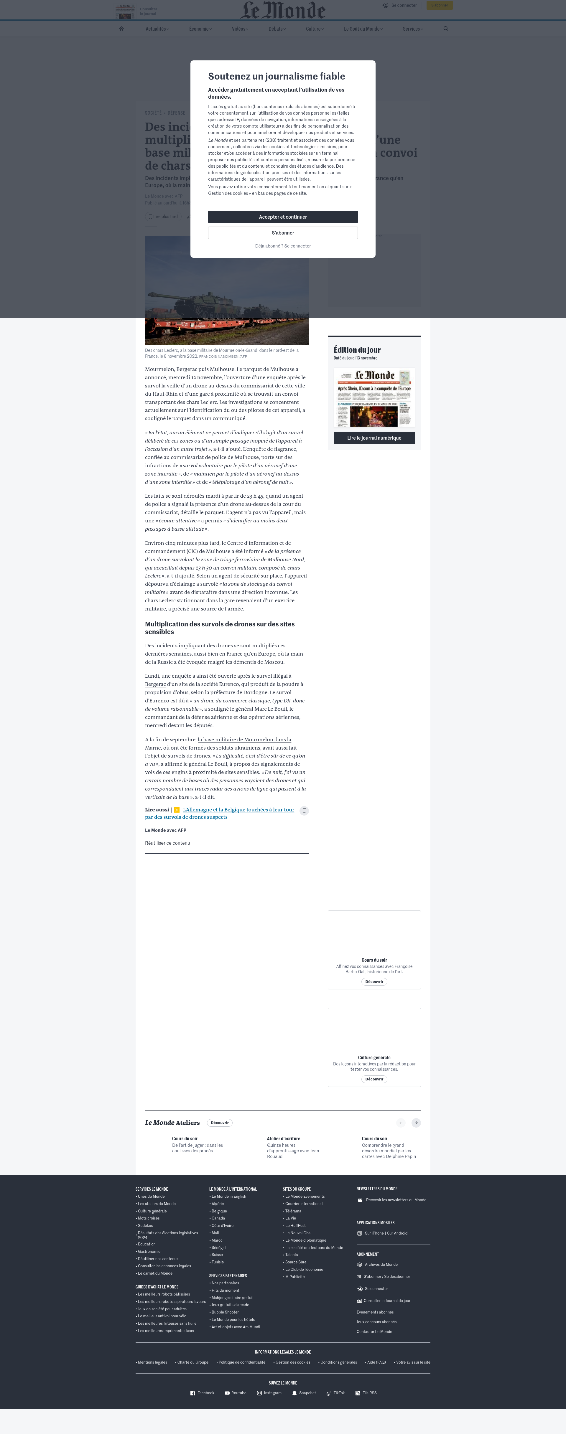 Des incidents impliquant des drones se multiplient en France : après les survols d’une base militaire et d’un dépôt de poudre, un convoi de chars Leclerc cibléDes incidents impliquant des drones se sont multipliés ces dernières semaines, aussi bien en France qu’en Europe, où la main de la Russie a été évoquée malgré les démentis de Moscou.PNGPDF