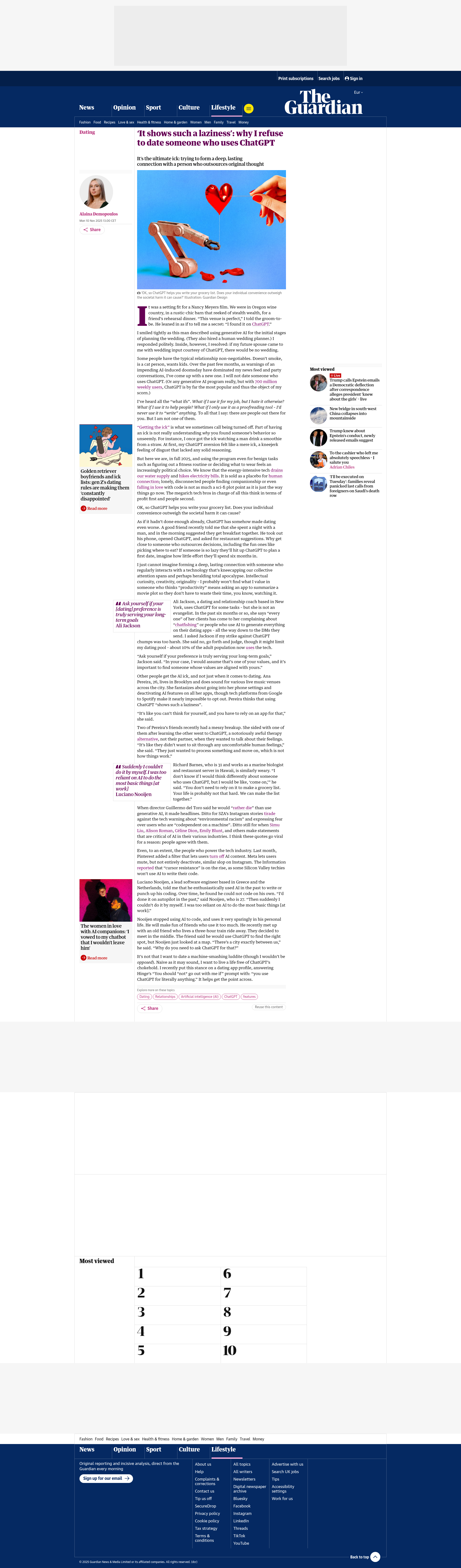 ‘It shows such a laziness’: why I refuse to date someone who uses ChatGPTIt’s the ultimate ick: trying to form a deep, lasting connection with a person who outsources original thoughtPNGPDF