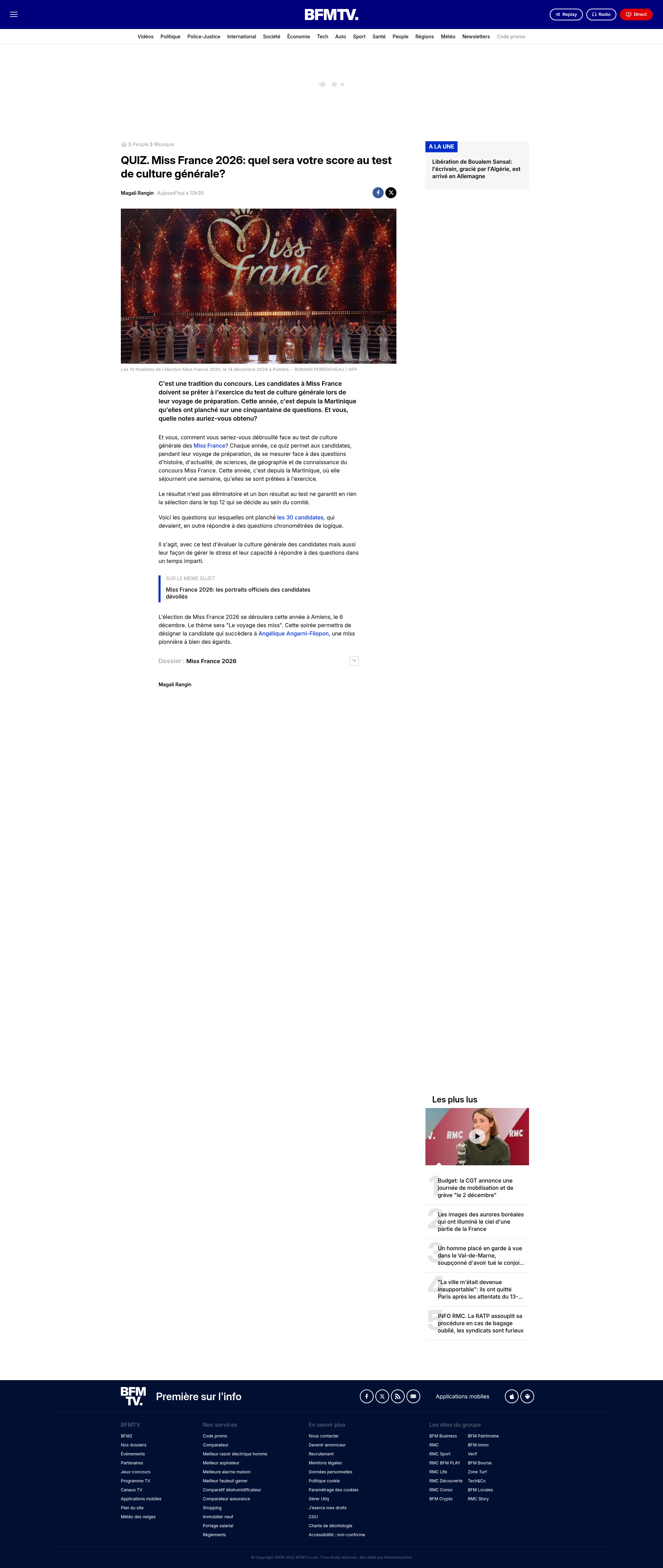 QUIZ. Miss France 2026: quel sera votre score au test de culture générale?C'est une tradition du concours. Les candidates à Miss France doivent se prêter à l'exercice du test de culture générale lors de leur voyage de préparation. Cette année, c'est depuis la Martinique qu'elles ont planché sur une cinquantaine de questions. Et vous, quelle notes auriez-vous obtenu?PNGPDF