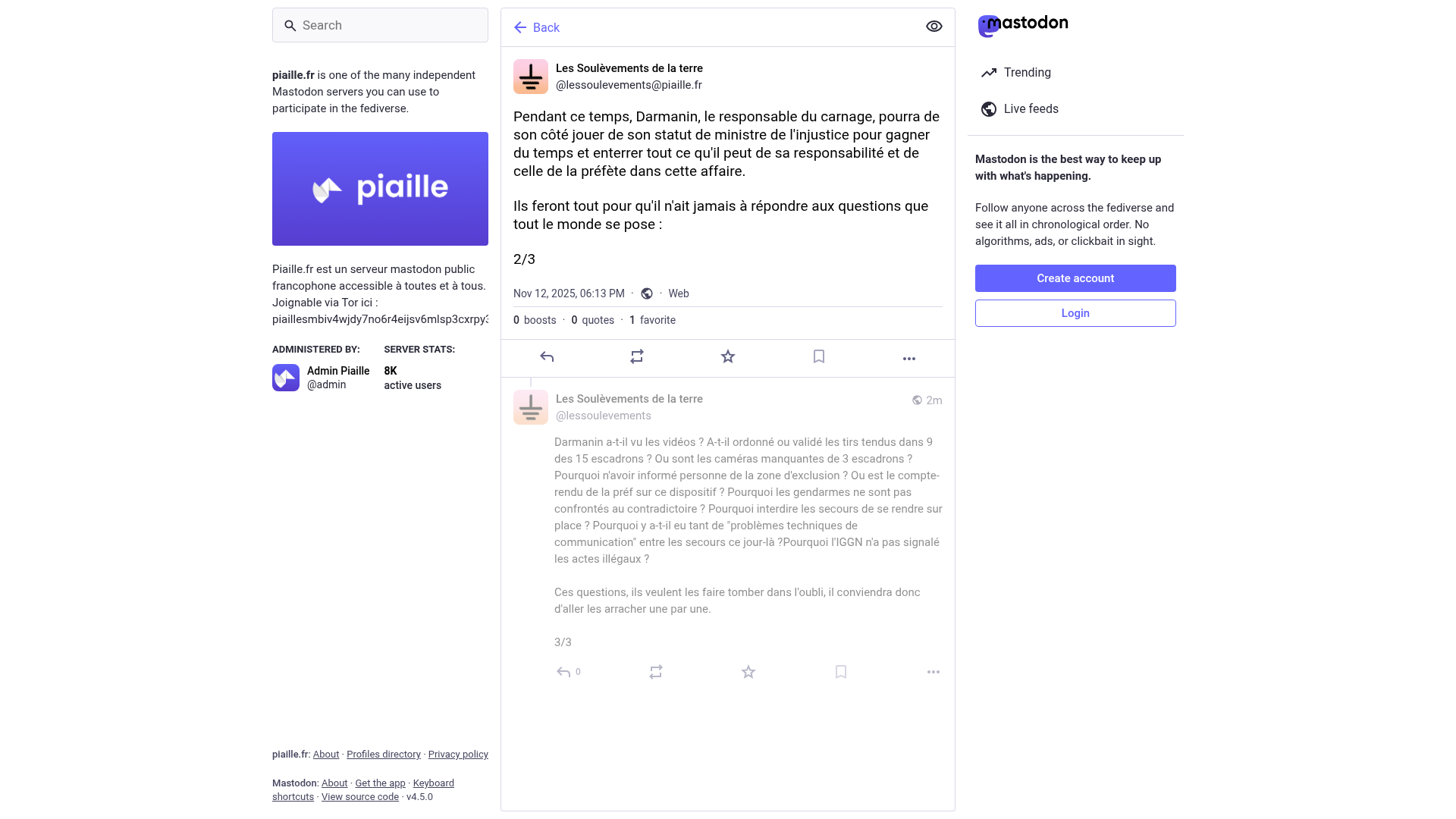 Les Soulèvements de la terre (@lessoulevements@piaille.fr)Pendant ce temps, Darmanin, le responsable du carnage, pourra de son côté jouer de son statut de ministre de l'injustice pour gagner du temps et enterrer tout ce qu'il peut de sa responsabilité et de celle de la préfète dans cette affaire. Ils feront tout pour qu'il n'ait jamais à répondre aux questions que tout le monde se pose : 2/3PNGPDF