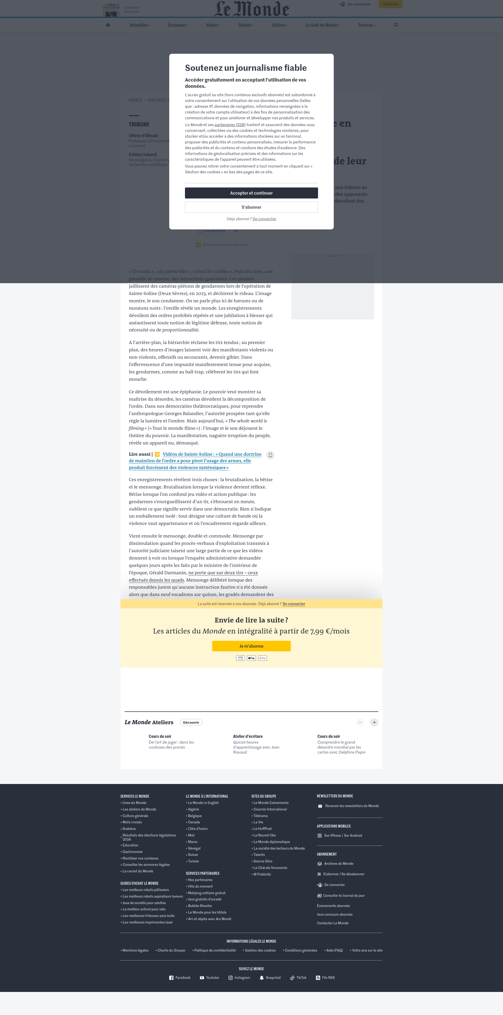 Manifestation à Sainte-Soline en 2023 : « Les vidéos révèlent la brutalisation, la bêtise et le mensonge des gendarmes et de leur hiérarchie »TRIBUNE. Les chercheurs Olivier Fillieule et Fabien Jobard estiment, dans une tribune au « Monde », que les images montrant des forces de l’ordre face à des opposants aux mégabassines, révélées par « Libération » et « Mediapart », dévoilent des ordres prohibés et une jubilation à blesser.PNGPDF