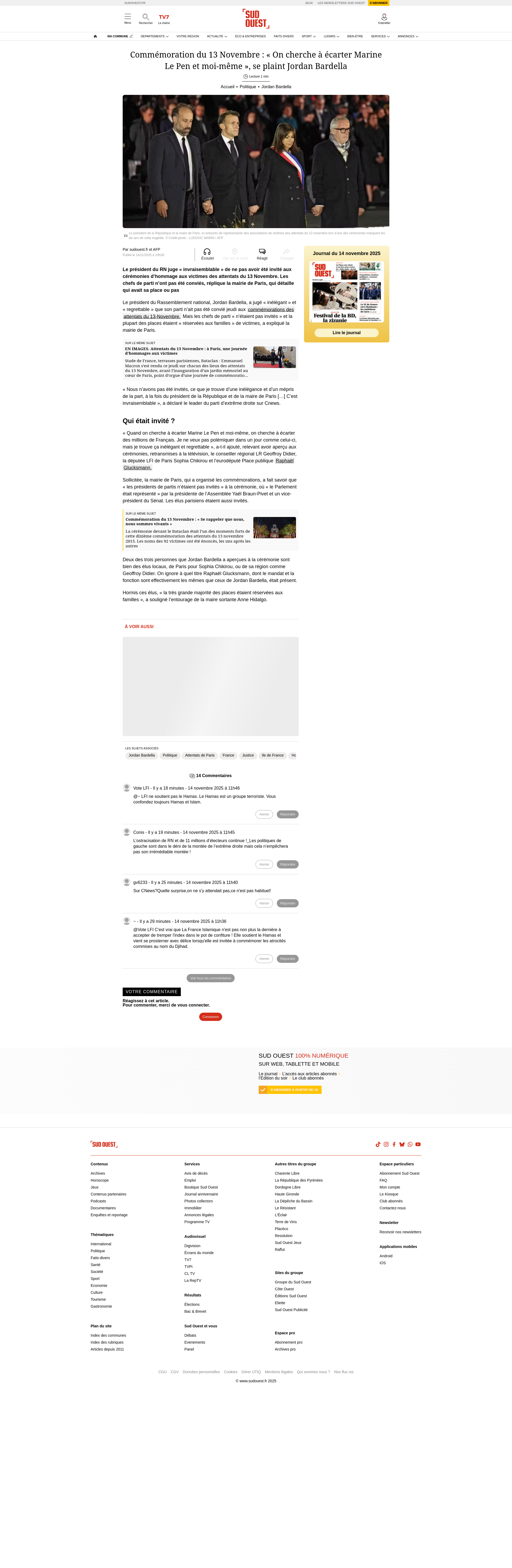 Commémoration du 13 Novembre : « On cherche à écarter Marine Le Pen et moi-même », se plaint Jordan BardellaLe président du RN juge « invraisemblable » de ne pas avoir été invité aux cérémonies d’hommage aux victimes des attentats du 13 Novembre. Les chefs de parti n’ont pas été conviés, réplique la mairie de Paris, qui détaille qui avait sa place ou pasPNGPDF