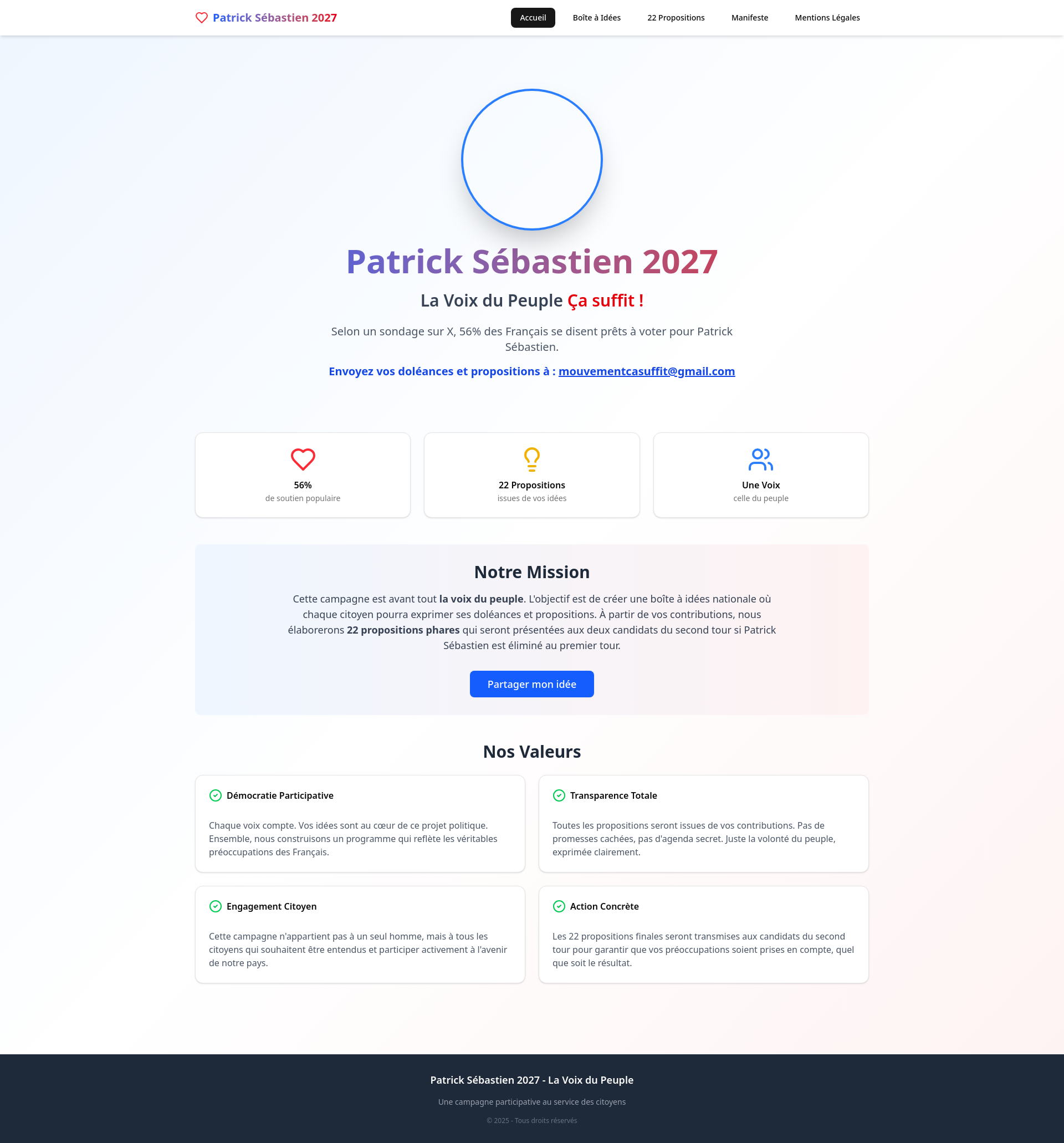 Patrick Sébastien 2027 - La Voix du PeupleCampagne présidentielle de Patrick Sébastien 2027 - Partagez vos idées et doléances pour construire ensemble les 22 propositions phares.PNGPDF