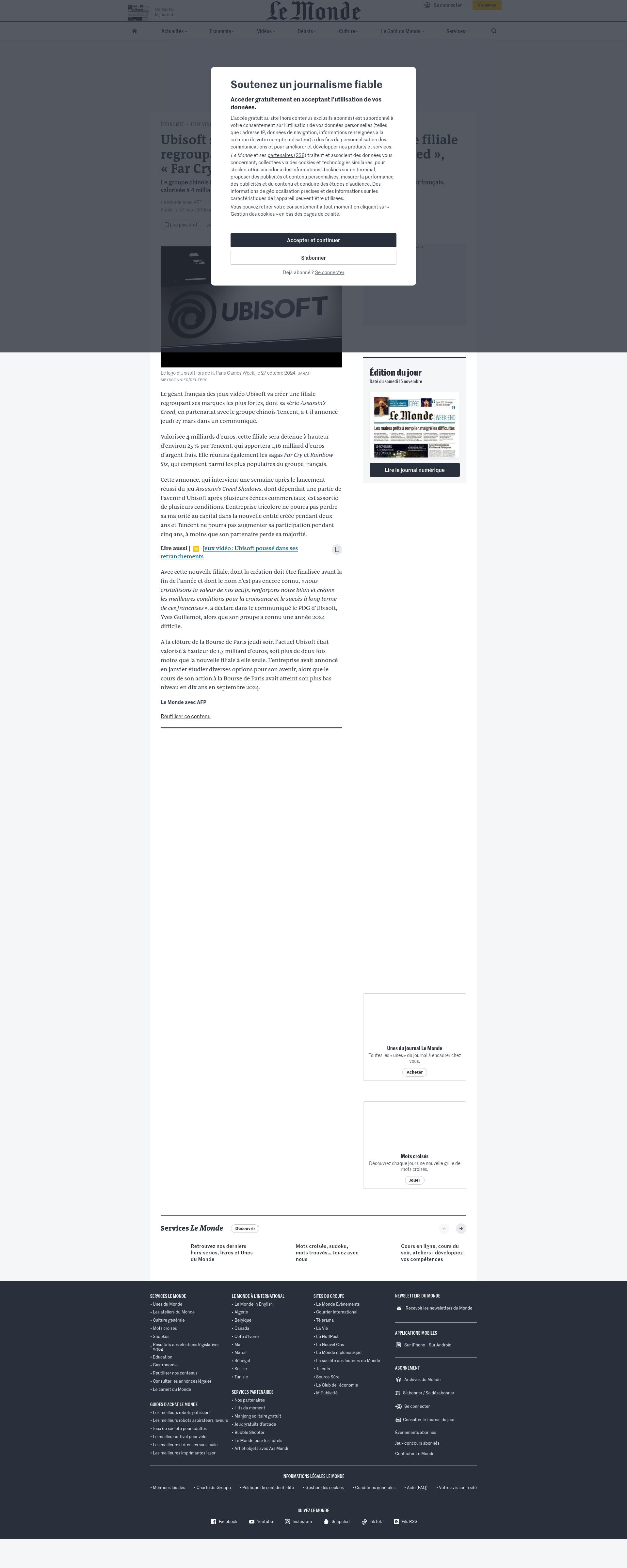 Ubisoft s’associe à Tencent pour créer une filiale regroupant les franchises « Assassin’s Creed », « Far Cry » et « Rainbow Six »Le groupe chinois investit 1,16 milliard d’euros pour détenir 25 % de la nouvelle filiale de l’éditeur français, valorisée à 4 milliards d’eurosPNGPDF
