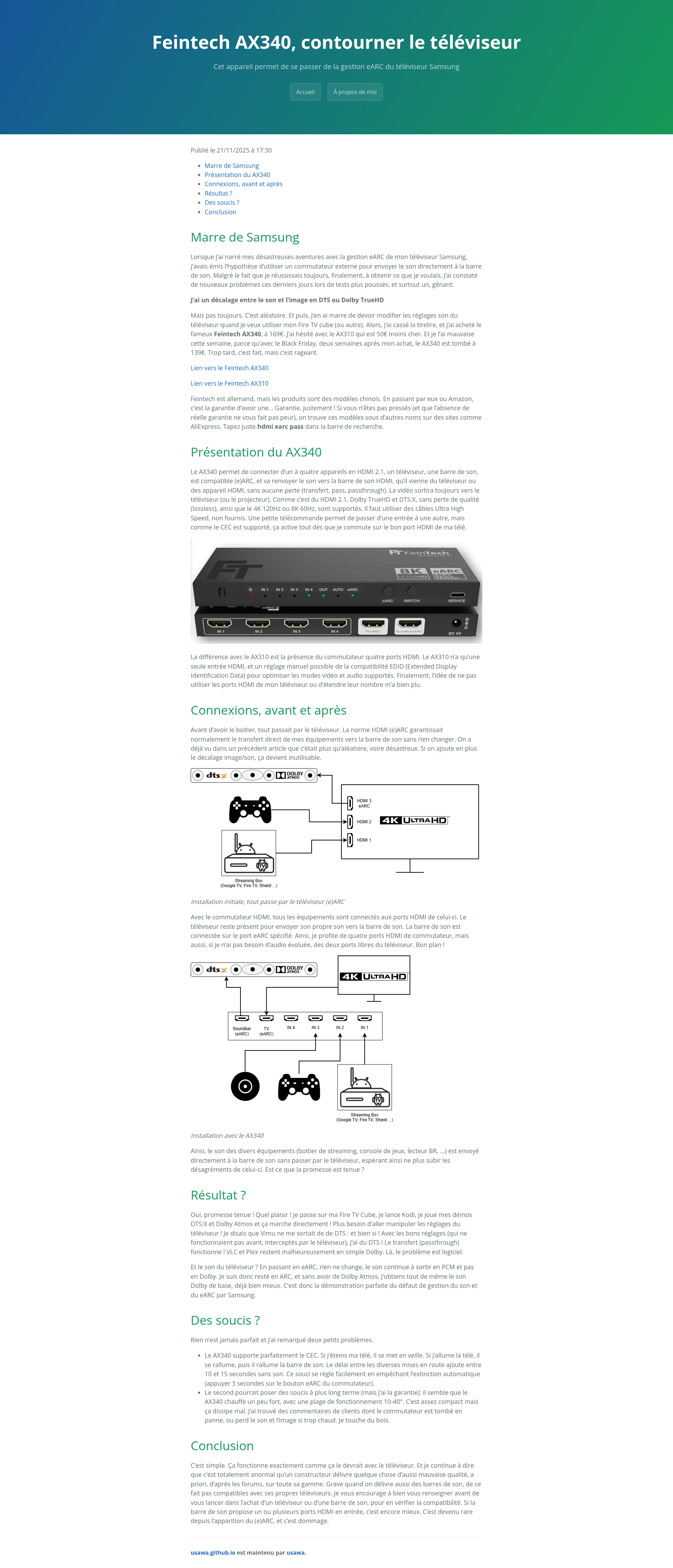 Feintech AX340, contourner le téléviseurCet appareil permet de se passer de la gestion eARC du téléviseur SamsungPNGPDF