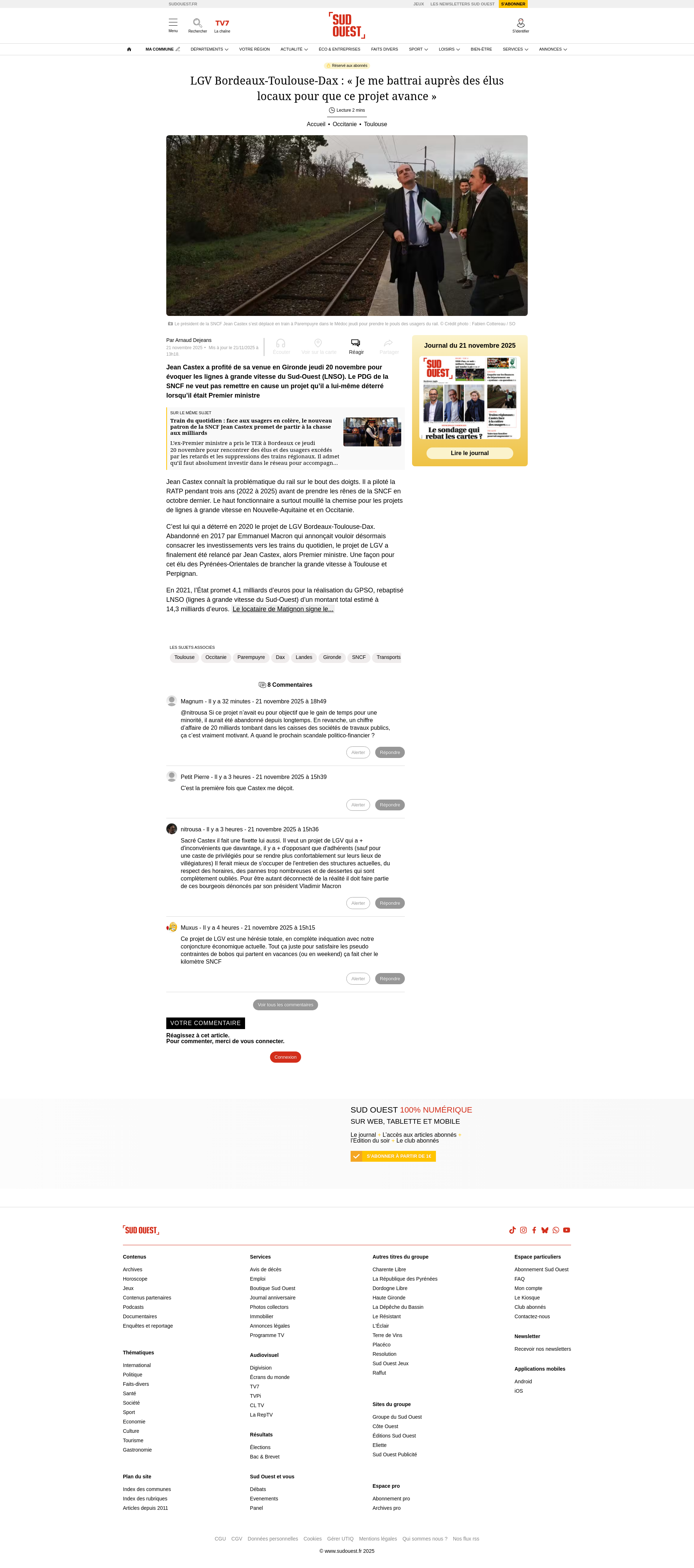 LGV Bordeaux-Toulouse-Dax : « Je me battrai auprès des élus locaux pour que ce projet avance »Jean Castex a profité de sa venue en Gironde jeudi 20 novembre pour évoquer les lignes à grande vitesse du Sud-Ouest (LNSO). Le PDG de la SNCF ne veut pas remettre en cause un projet qu’il a lui-même déterré lorsqu’il était Premier ministrePNGPDF