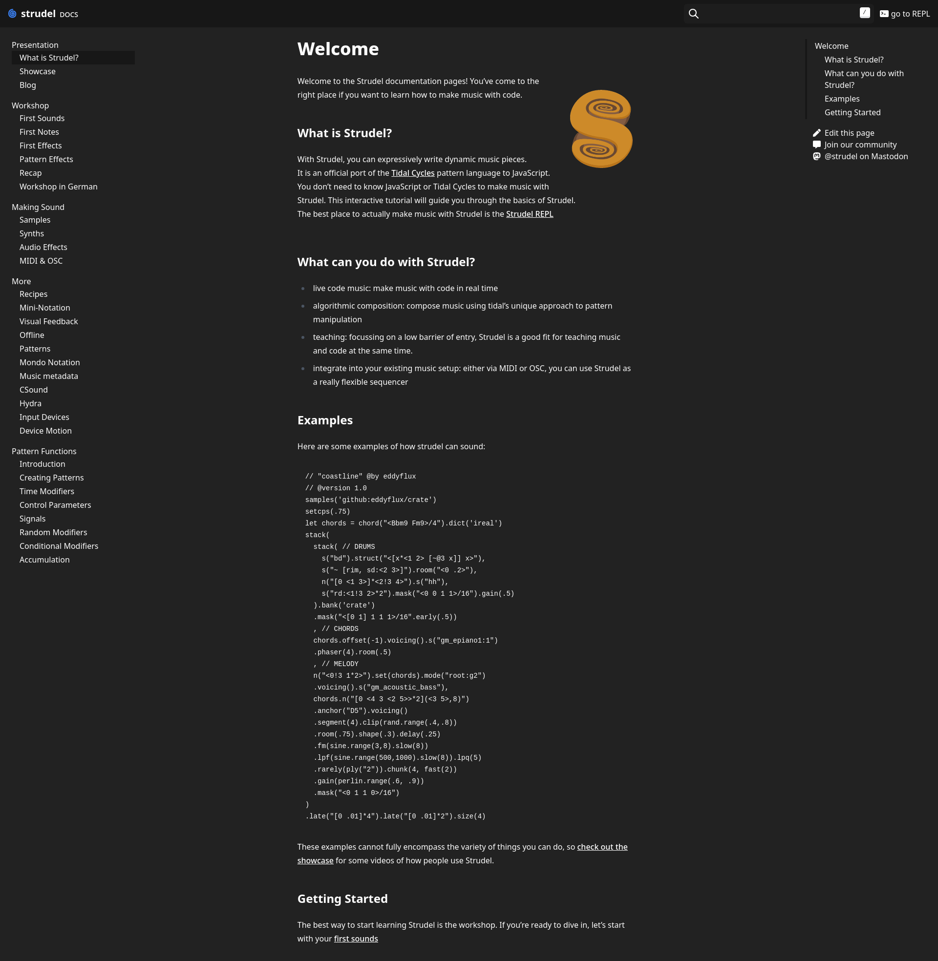 Getting Started 🚀 StrudelStrudel is a music live coding editor that brings TidalCycles to the browser.PNGPDF