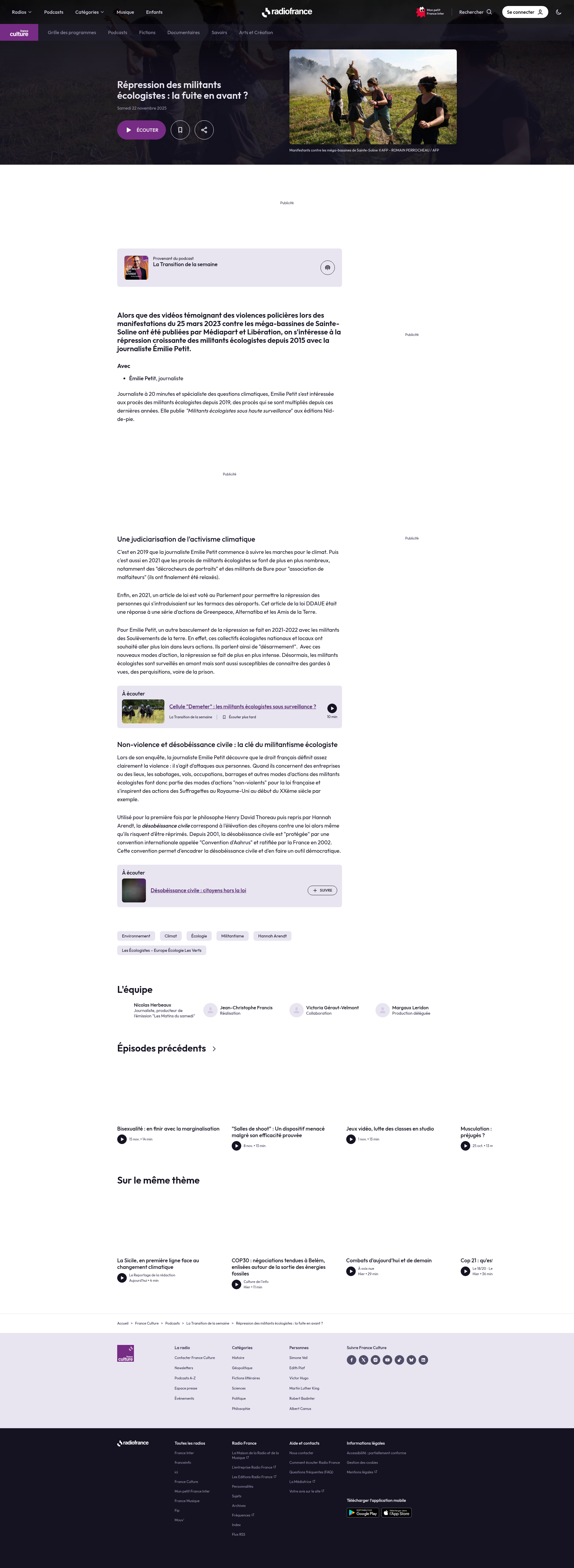 Répression des militants écologistes : la fuite en avant ? Alors que des vidéos témoignant des violences policières lors des manifestations du 25 mars 2023 contre les méga-bassines de Sainte-Soline ont été publiées par Médiapart et Libération, on s'intéresse à la répression croissante des militants écologistes depuis 2015 avec la journaliste Émilie Petit. PNGPDF