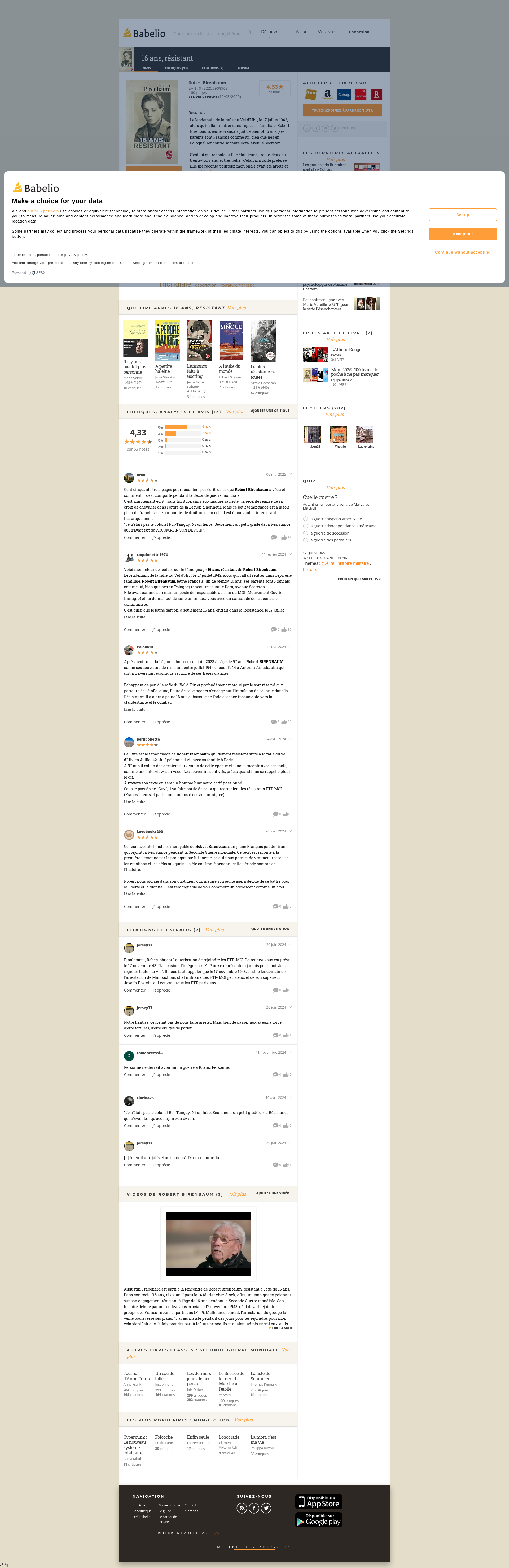 16 ans, résistant - Robert BirenbaumCritiques (13), citations (7), extraits de 16 ans, résistant de Robert Birenbaum. Cent cinquante trois pages pour raconter , par écrit, de ce que Robert...PNGPDF