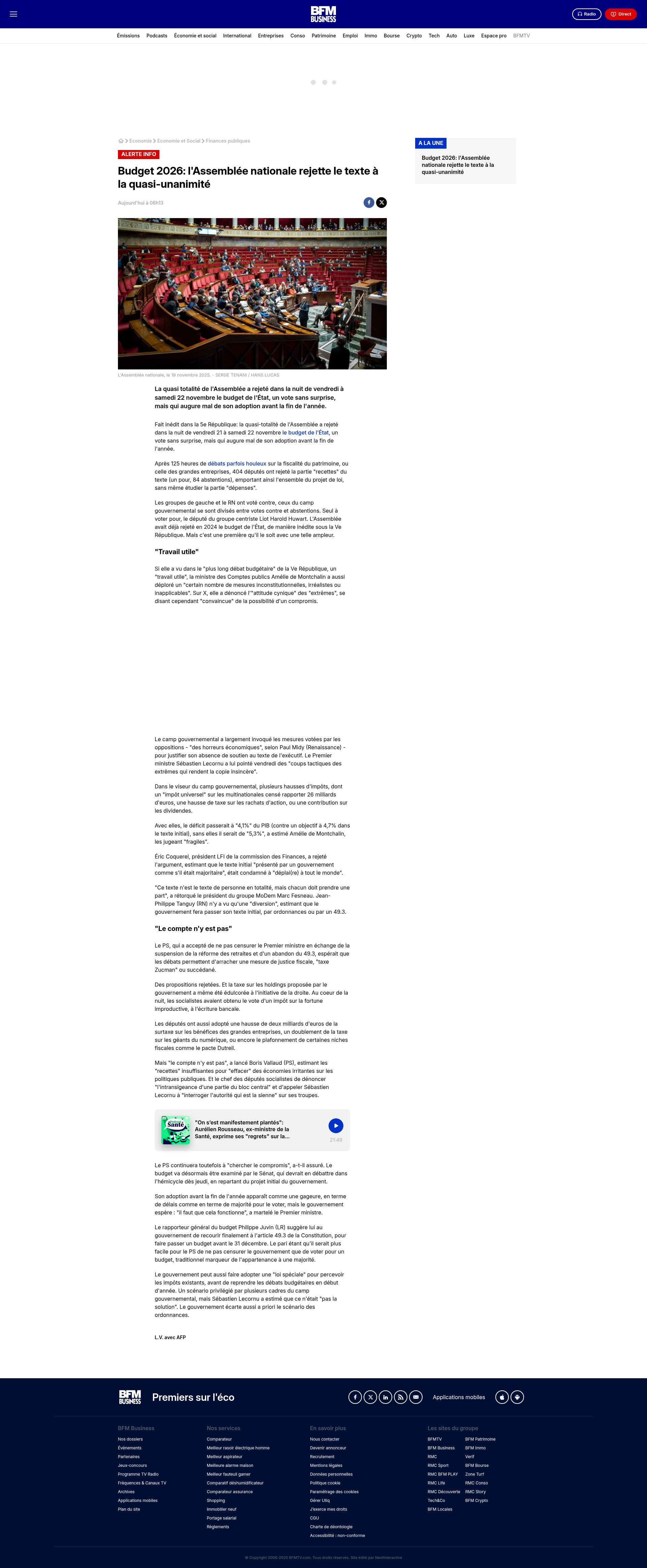 Budget 2026: l'Assemblée nationale rejette le texte à la quasi-unanimitéLa quasi totalité de l'Assemblée a rejeté dans la nuit de vendredi à samedi 22 novembre le budget de l'État, un vote sans surprise, mais qui augure mal de son adoption avant la fin de l'année.PNGPDF
