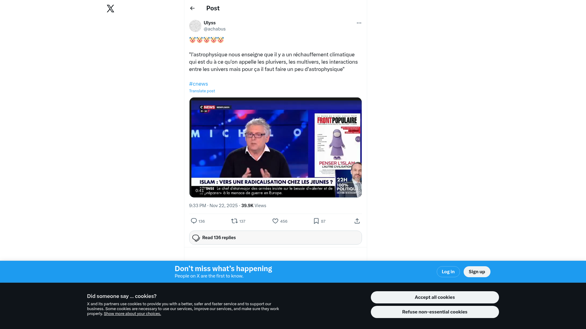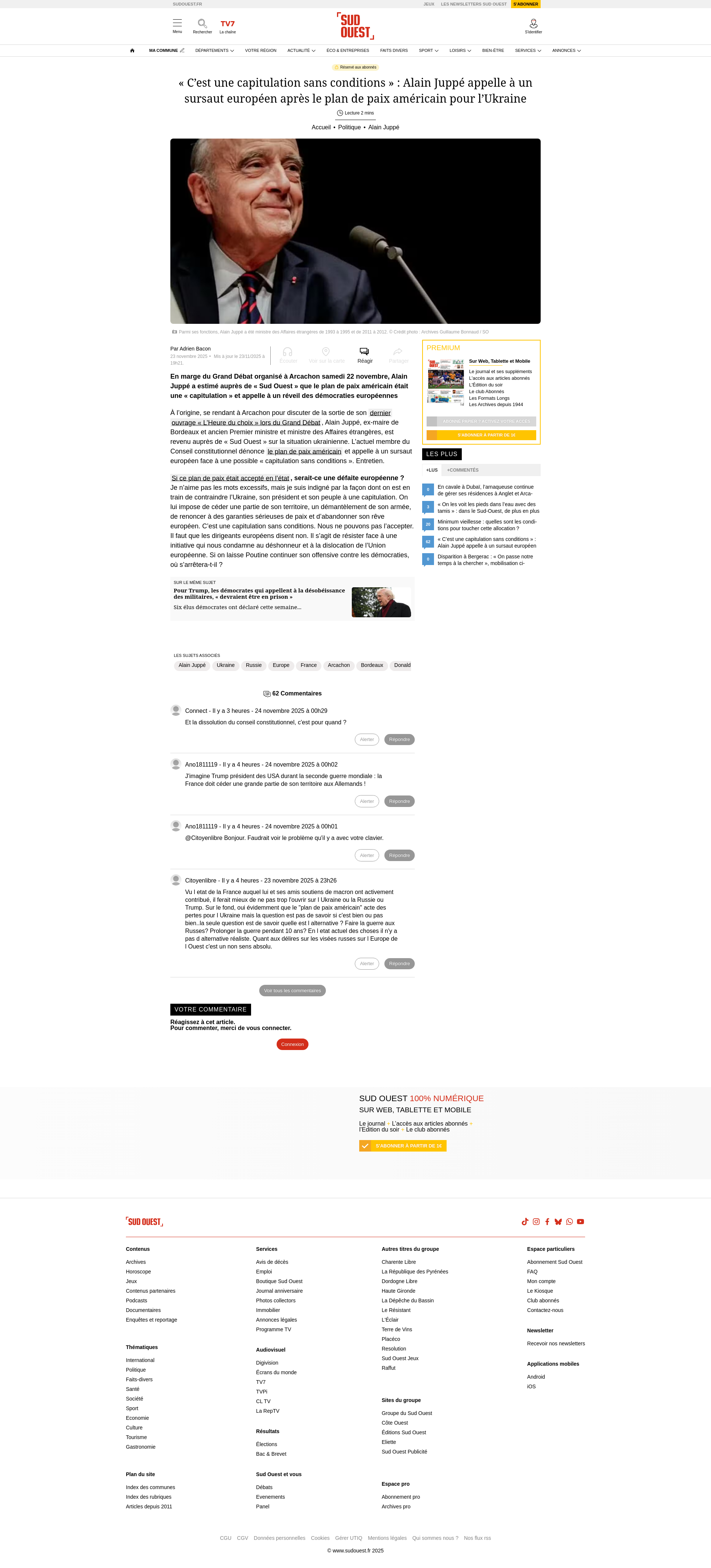 « C’est une capitulation sans conditions » : Alain Juppé appelle à un sursaut européen après le plan de paix américain pour l’UkraineEn marge du Grand Débat organisé à Arcachon samedi 22 novembre, Alain Juppé a estimé auprès de « Sud Ouest » que le plan de paix américain était une « capitulation » et appelle à un réveil des démocraties européennesPNGPDF