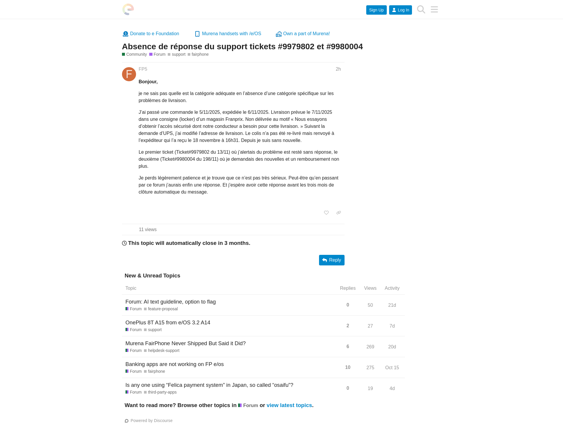 Absence de réponse du support tickets #9979802 et #9980004Bonjour, je ne sais pas quelle est la catégorie adéquate en l’absence d’une catégorie spécifique sur les problèmes de livraison. J’ai passé une commande le 5/11/2025, expédiée le 6/11/2025. Livraison prévue le 7/11/2025 dans une consigne (locker) d’un magasin Franprix. Non délivrée au motif « Nous essayons d’obtenir l’accès sécurisé dont notre conducteur a besoin pour cette livraison. » Suivant la demande d’UPS, j’ai modifié l’adresse de livraison. Le colis n’a pas été re-livré mais renvoyé à ...PNGPDF