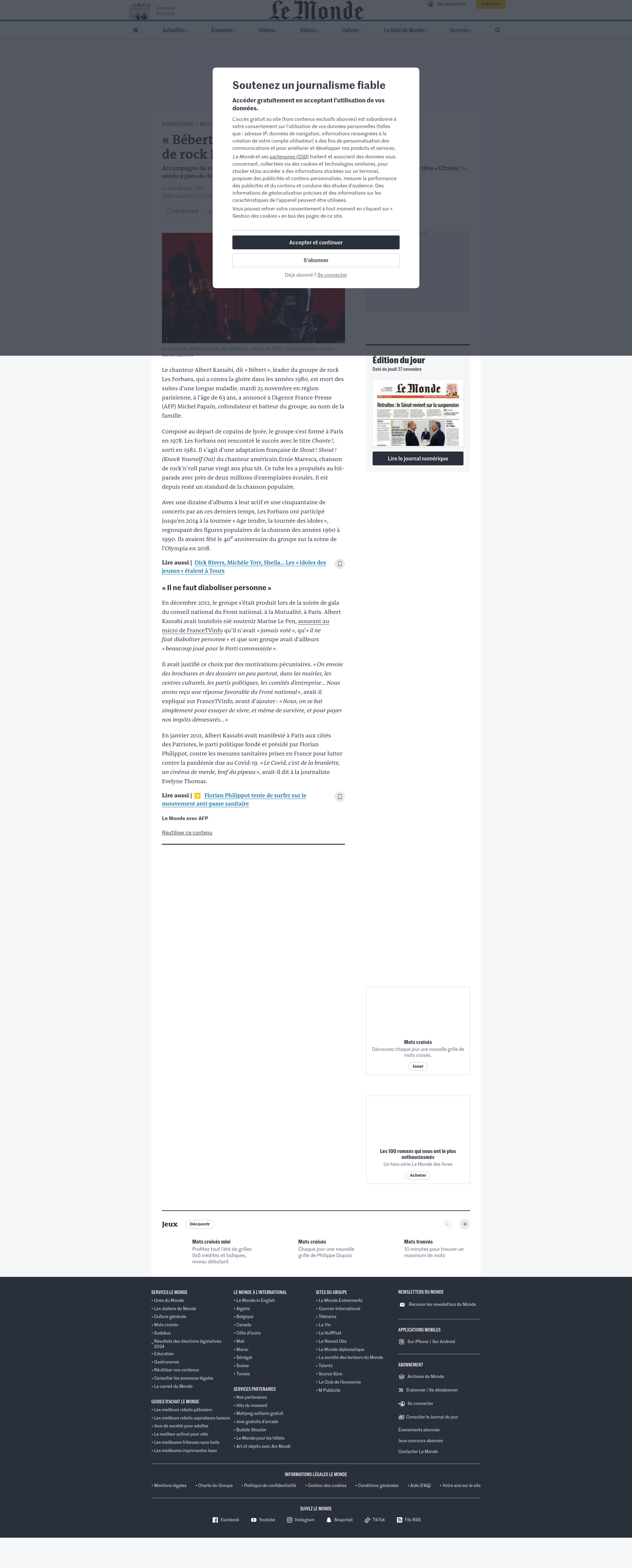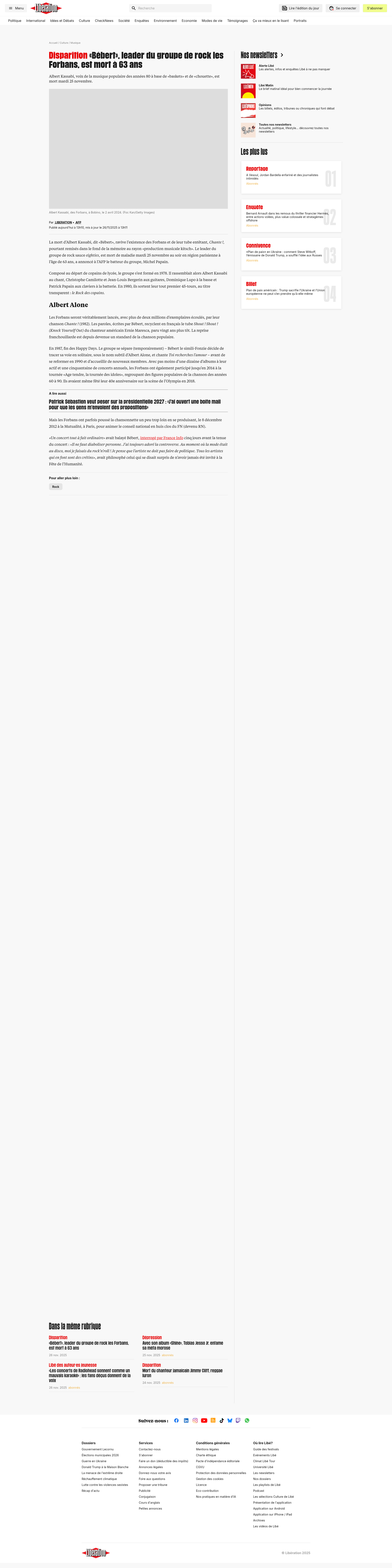 «Bébert», leader du groupe de rock les Forbans, est mort à 63 ansAlbert Kassabi, voix de la musique populaire des années 80 à base de «baskets» et de «chouette», est mort mardi 25 novembre. PNGPDF