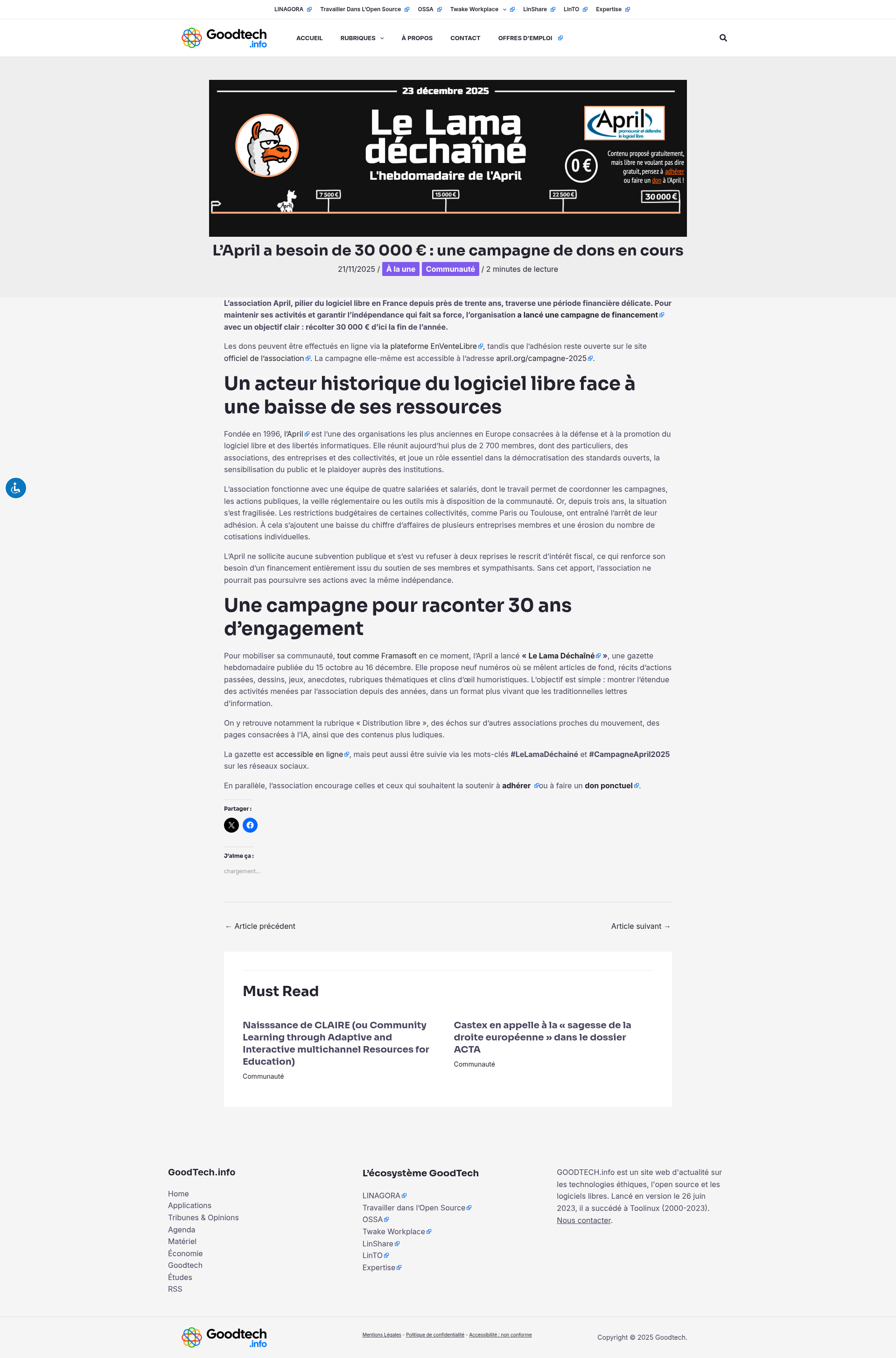 L’April lance une campagne de soutien : 30 000 € nécessaires pour poursuivre ses actionsL’association April, pilier français du logiciel libre, appelle à récolter 30 000 € pour poursuivre ses actions en 2025. Une campagne originale, « Le Lama Déchaîné », retrace ses engagements.PNGPDF