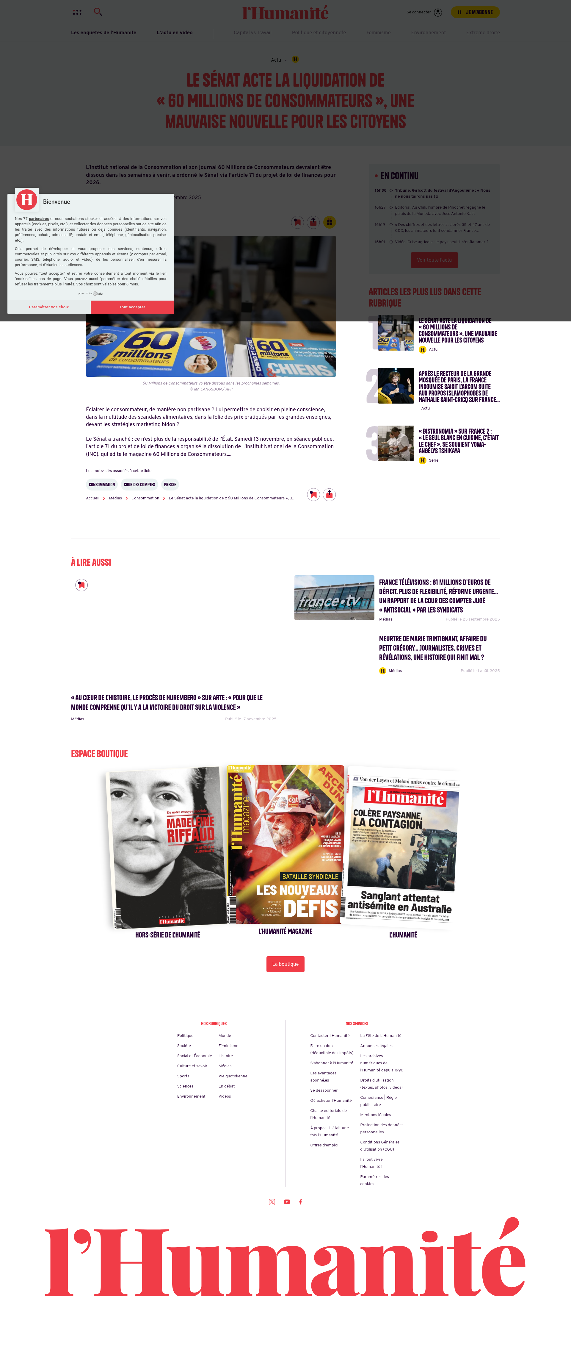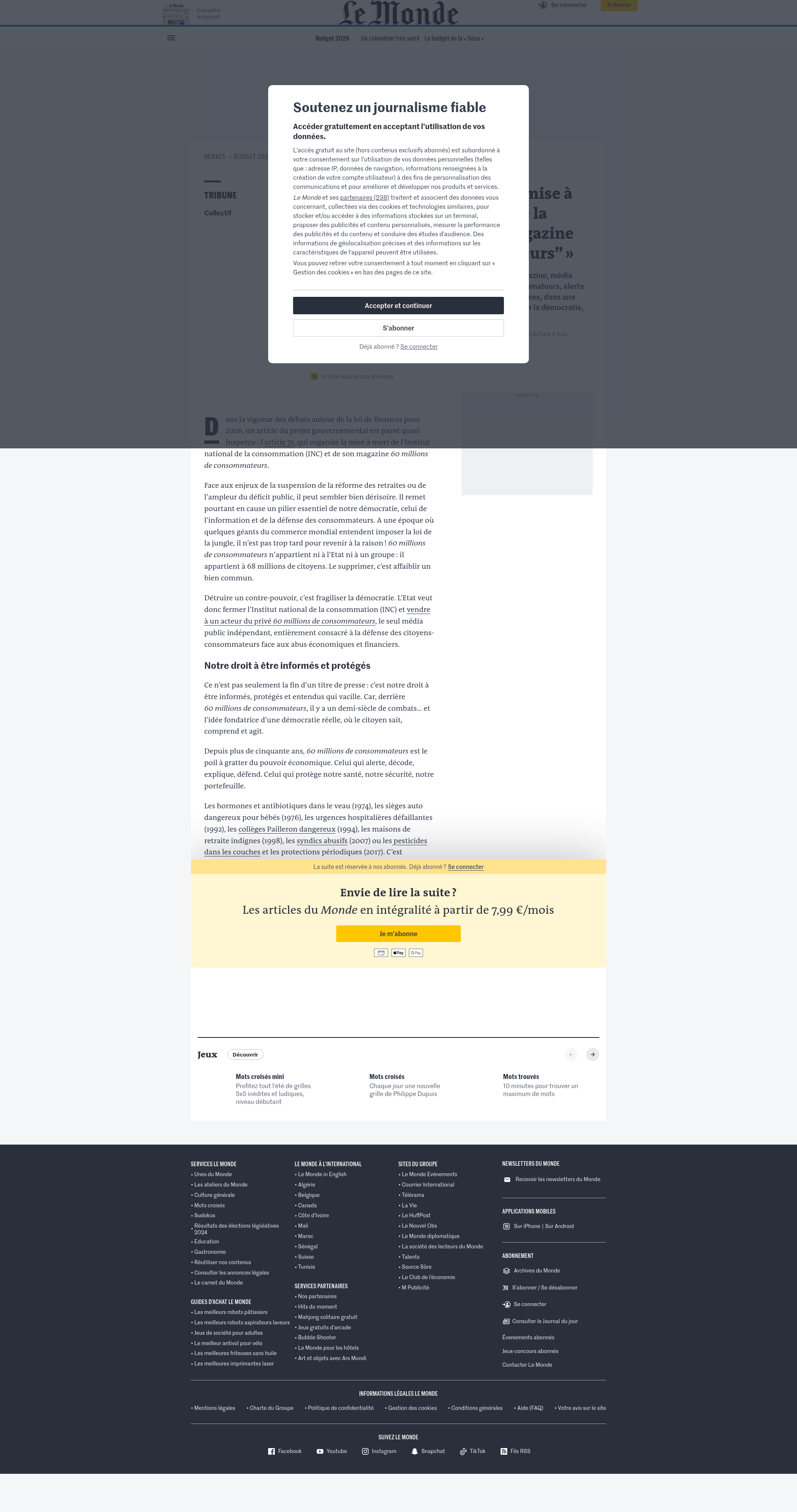 « Le budget 2026 organise la mise à mort de l’Institut national de la consommation et de son magazine “60 millions de consommateurs” »TRIBUNE. Le gouvernement prévoit de fermer l’INC et de vendre son magazine, média public indépendant consacré à la défense des citoyens-consommateurs, alerte un collectif de personnalités politiques, syndicales et associatives, dans une tribune au « Monde ». Détruire un contre-pouvoir, c’est fragiliser la démocratie, explique-t-il.PNGPDF