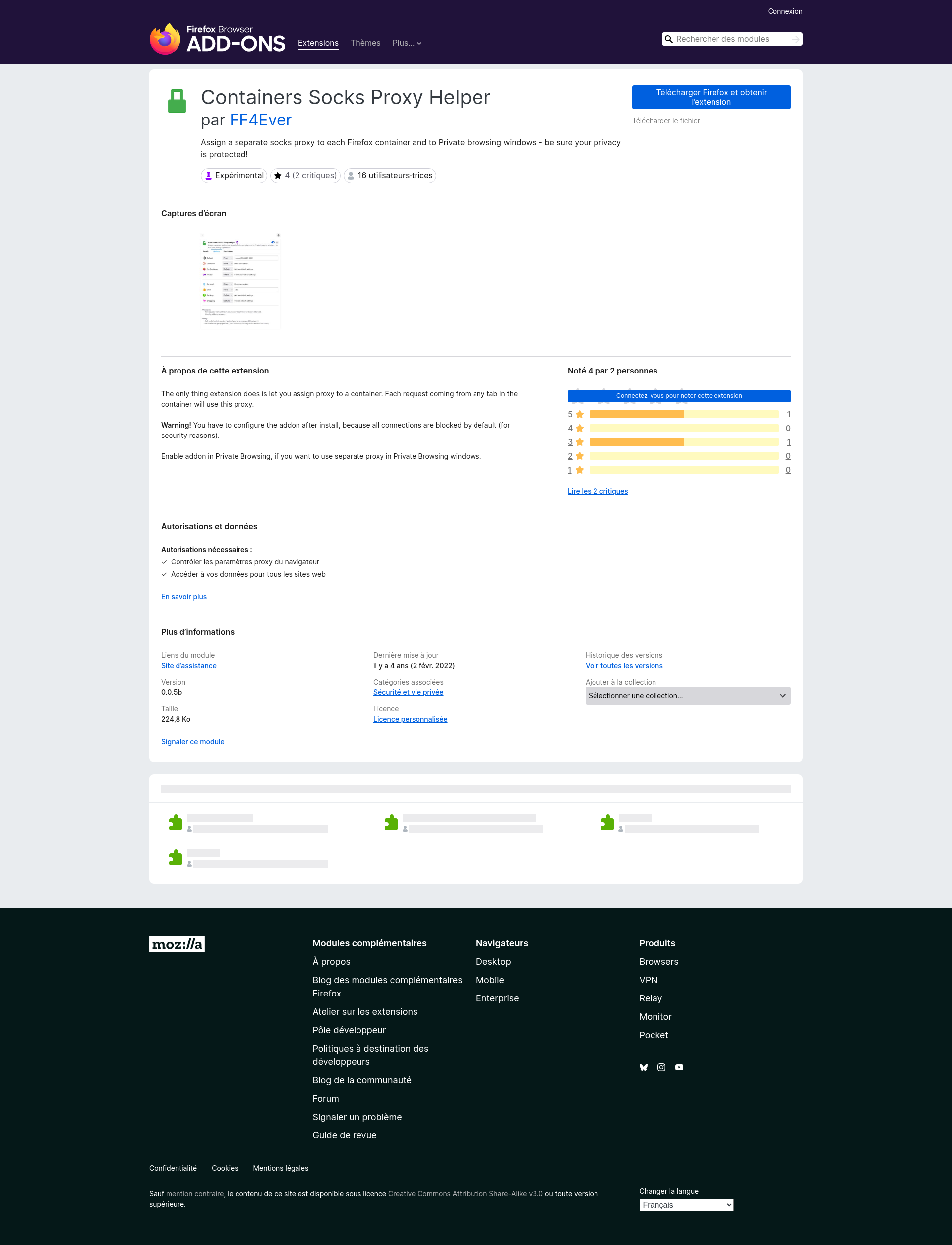 Containers Socks Proxy Helper – Adoptez cette extension pour 🦊 Firefox (fr)Télécharger Containers Socks Proxy Helper pour Firefox. Assign a separate socks proxy to each Firefox container and to Private browsing windows - be sure your privacy is protected!PNGPDF