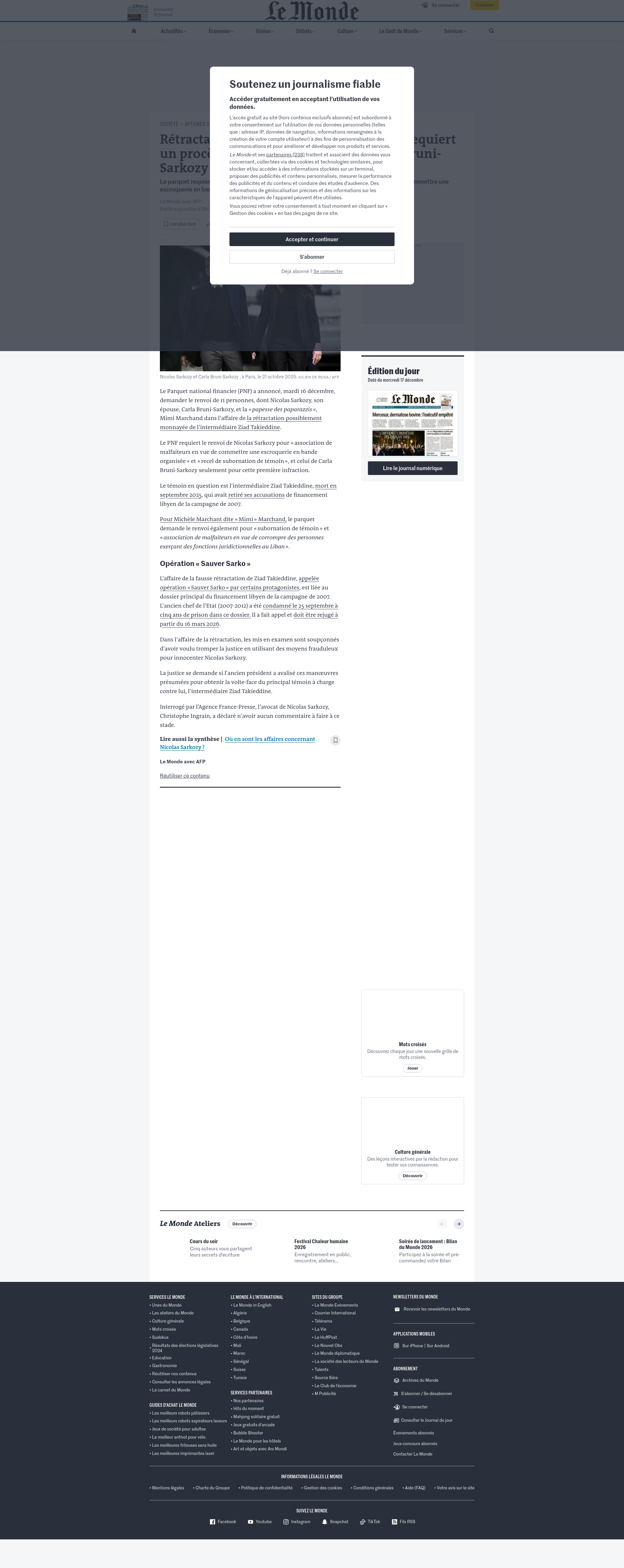 Rétractation de Ziad Takieddine : le PNF requiert un procès contre Nicolas Sarkozy, Carla Bruni-Sarkozy et Mimi MarchandLe parquet requiert le renvoi de Nicolas Sarkozy pour « association de malfaiteurs en vue de commettre une escroquerie en bande organisée » et « recel de subornation de témoin ».PNGPDF