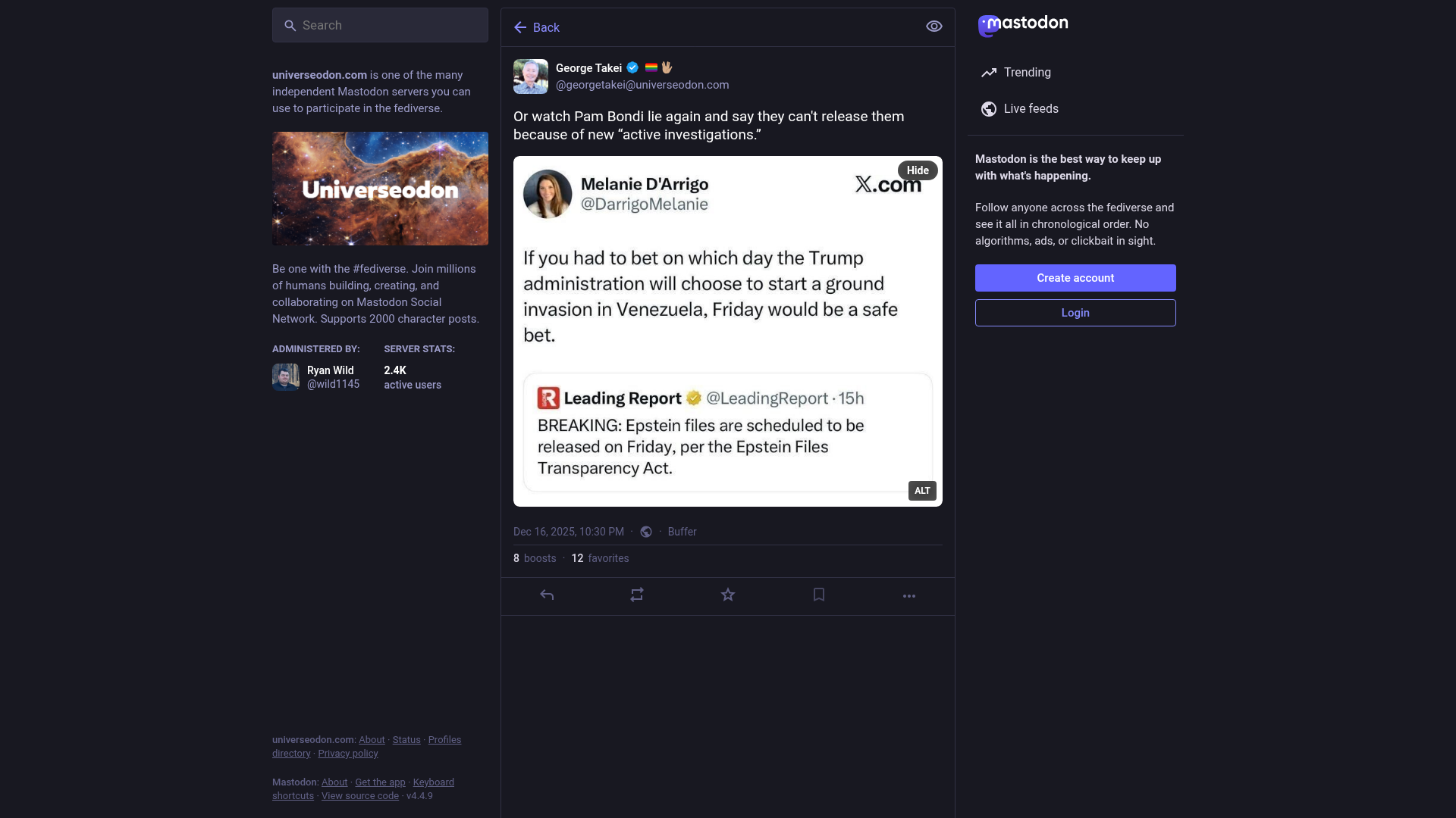 George Takei :verified: 🏳️🌈🖖🏽 (@georgetakei@universeodon.com)Attached: 1 image Or watch Pam Bondi lie again and say they can't release them because of new “active investigations.”PNGPDF