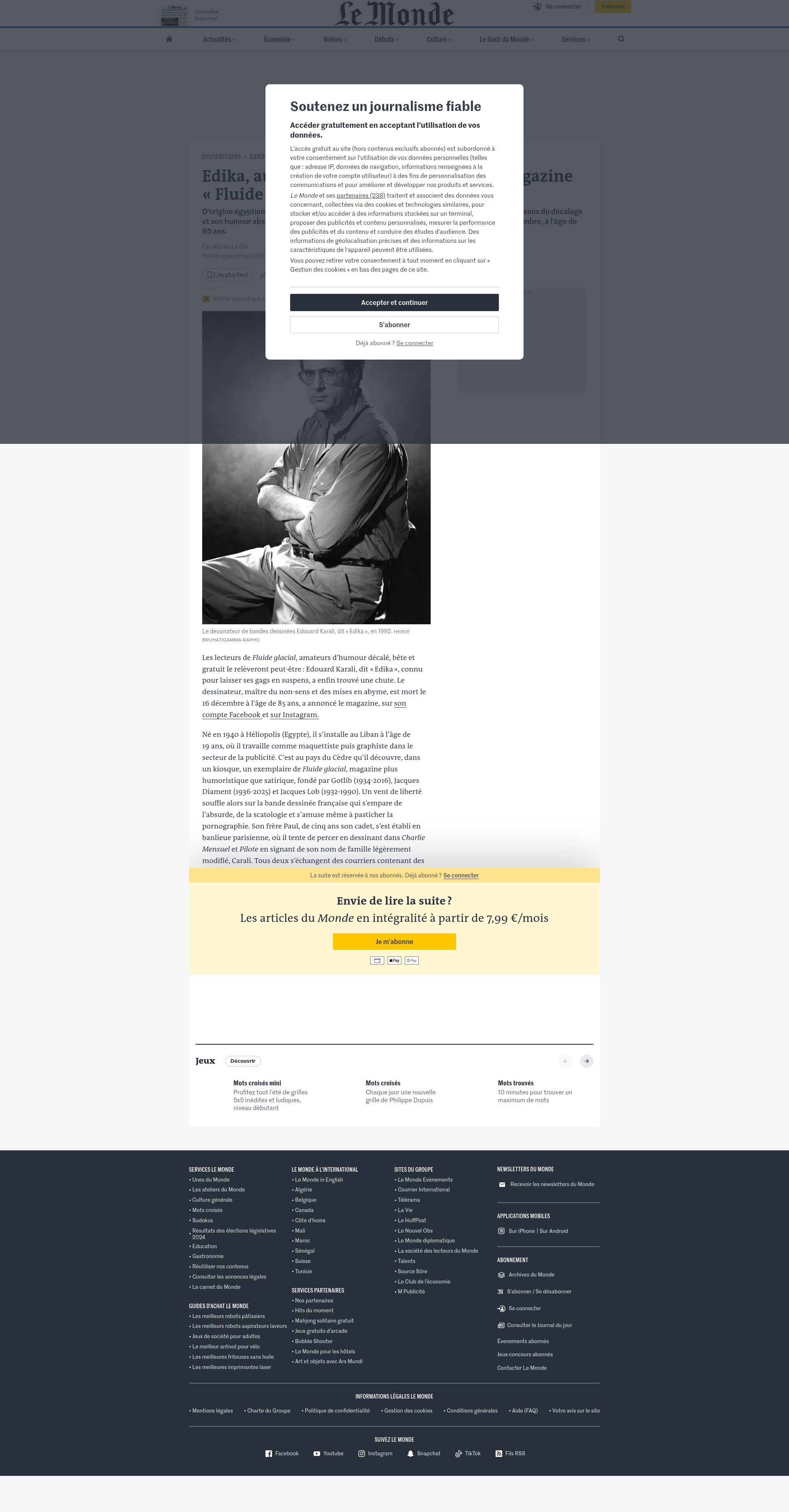 Edika, auteur de BD emblématique du magazine « Fluide glacial », est mortD’origine égyptienne, il s’était installé en France dans les années 1970 et se distinguait par son sens du décalage et son humour absurde, propice à la mise en images de ses obsessions. Il s’est éteint le 16 décembre, à l’âge de 85 ans.PNGPDF