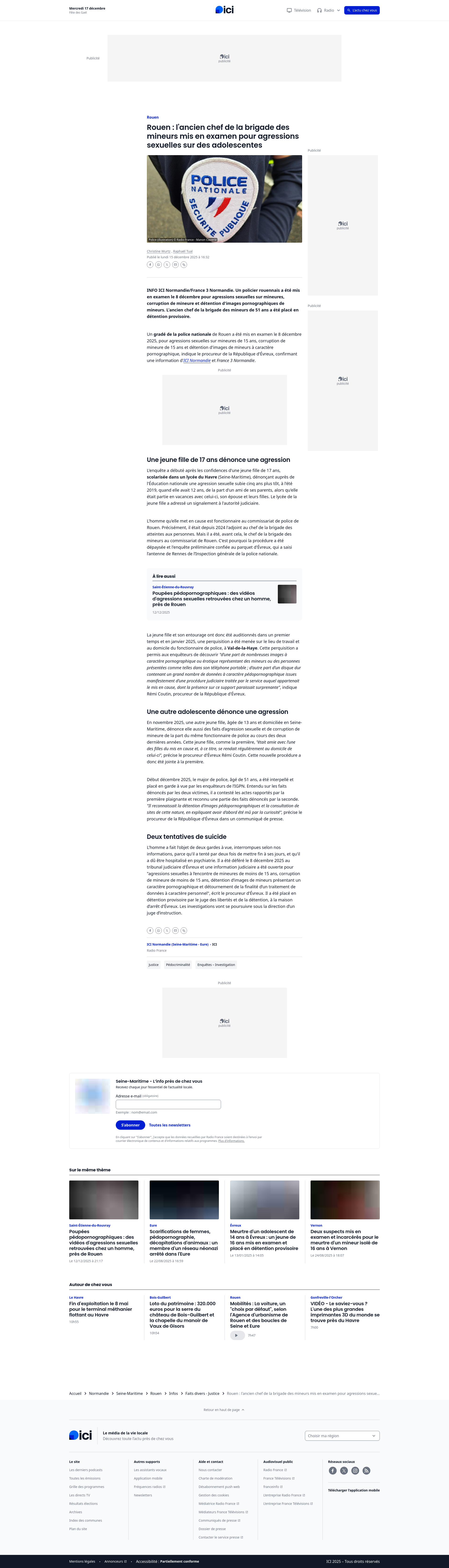 Rouen : l'ancien chef de la brigade des mineurs mis en examen pour agressions sexuelles sur des adolescentes - ICIINFO ICI Normandie/France 3 Normandie. Un policier rouennais a été mis en examen le 8 décembre pour agressions sexuelles sur mineures, corruption de mineure et détention d'images pornographiques de mineurs. L'ancien chef de la brigade des mineurs de 51 ans a été placé en détention provisoire.PNGPDF
