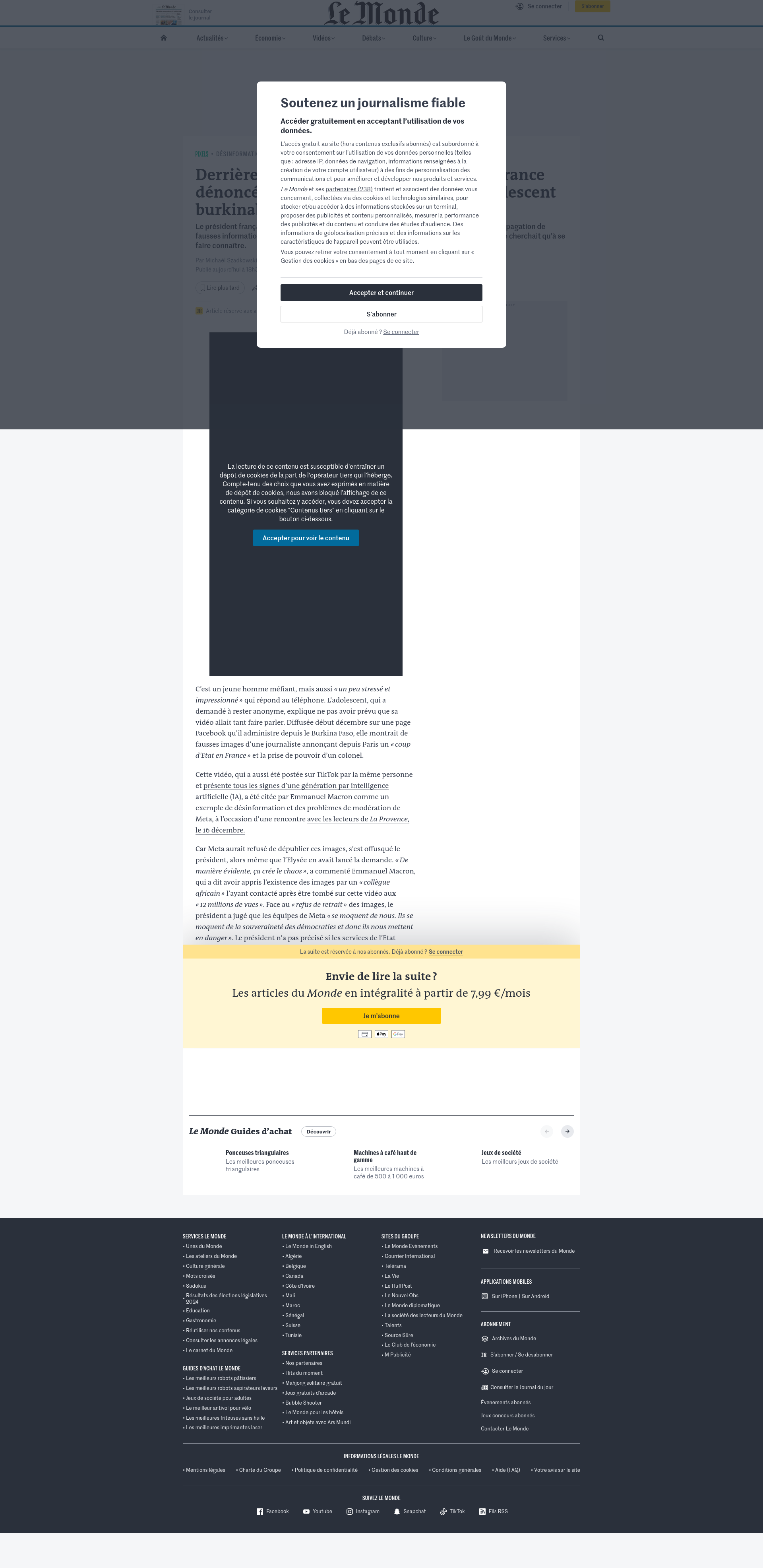 Derrière la vidéo du faux coup d’Etat en France dénoncée par Emmanuel Macron, un adolescent burkinabé qui voulait « percer »Le président français a dénoncé une vidéo Facebook générée par IA comme un exemple de propagation de fausses informations et des manquements de Meta. Le diffuseur des images assure, lui, qu’il ne cherchait qu’à se faire connaître.PNGPDF