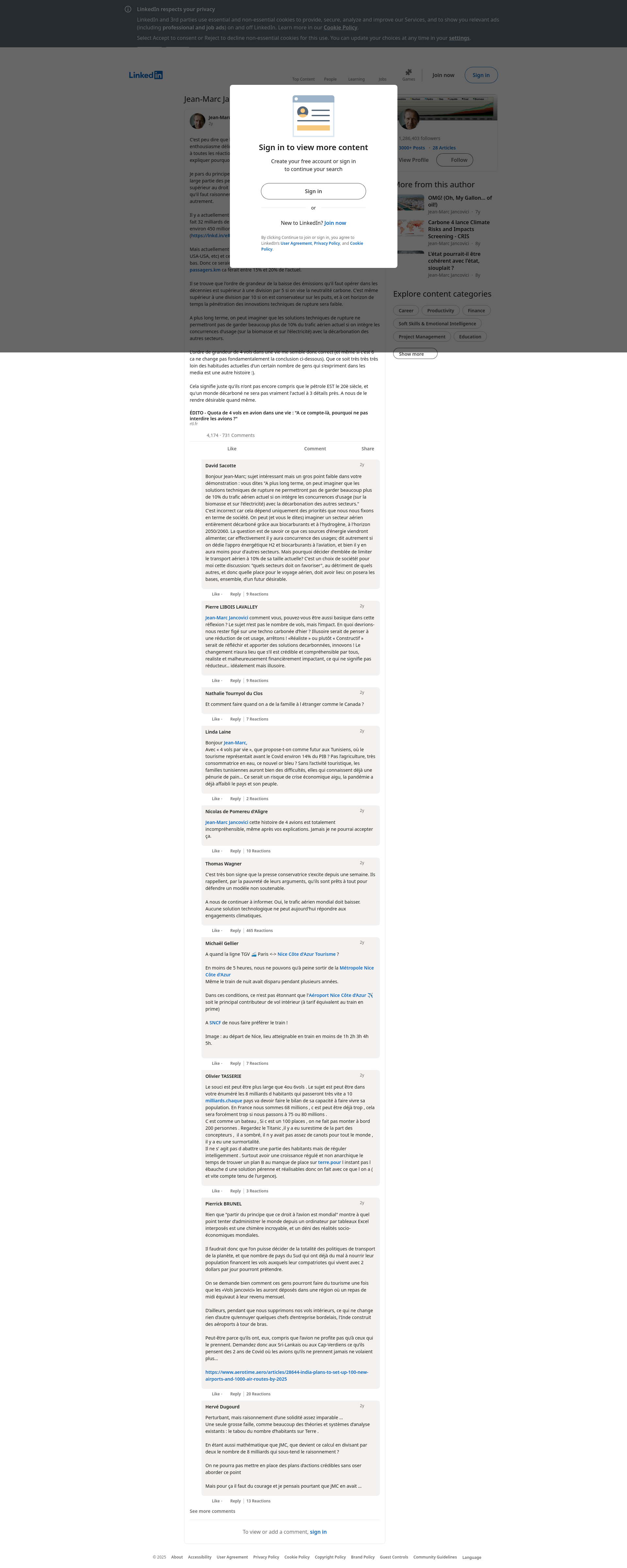 ÉDITO - Quota de 4 vols en avion dans une vie : "A ce compte-là, pourquoi ne pas interdire les avions ?" | Jean-Marc Jancovici | 731 commentsC'est peu dire que l'évocation de 4 vols aériens dans une vie ne provoque pas un enthousiasme délirant dans le monde médiatique. Je ne vais pas ici chercher à répondre à toutes les réactions m'accusant d'être liberticide, insensé, ou totalitaire, mais juste expliquer pourquoi 4 vols dans une vie et pas 10 ou 1. Je pars du principe que ce "droit à l'avion" est mondial. Evidemment, peut-être qu'une large partie des personnes qui ont "mal" réagi considèrent que leur droit à l'avion est supérieur au droit encore inexistant des somaliens ou d'une large partie des indiens, et qu'il faut raisonner à partir des gens qui prennent actuellement l'avion et pas autrement. Il y a actuellement 8 milliards de personnes dans le monde. Avec 4 vols dans une vie ca fait 32 milliards de vols sur une vie. Admettons qu'une vie soit 70 ans. Ca nous amène à environ 450 millions de vols par an, soit 10% du trafic pré-covid (https://lnkd.in/eRnV47yR ) et presque 20% de l'actuel. Mais actuellement une moitié des vols sont raisonnablement courts (Europe-Europe, USA-USA, etc) et ce ne sont pas ceux qui seraient conservés si on avait un quota un peu bas. Donc ce seraient surtout des vols longs qui seraient conservés, et en termes de passagers.km ca ferait entre 15% et 20% de l'actuel. Il se trouve que l'ordre de grandeur de la baisse des émissions qu'il faut opérer dans les décennies est supérieur à une division par 5 si on vise la neutralité carbone. C'est même supérieur à une division par 10 si on est conservateur sur les puits, et à cet horizon de temps la pénétration des innovations techniques de rupture sera faible. A plus long terme, on peut imaginer que les solutions techniques de rupture ne permettront pas de garder beaucoup plus de 10% du trafic aérien actuel si on intègre les concurrences d'usage (sur la biomasse et sur l'électricité) avec la décarbonation des autres secteurs. L'ordre de grandeur de 4 vols dans une vie me semble donc correct (et même si c'est 6 ca ne change pas fondamentalement la conclusion ci-dessous). Que PNGPDF