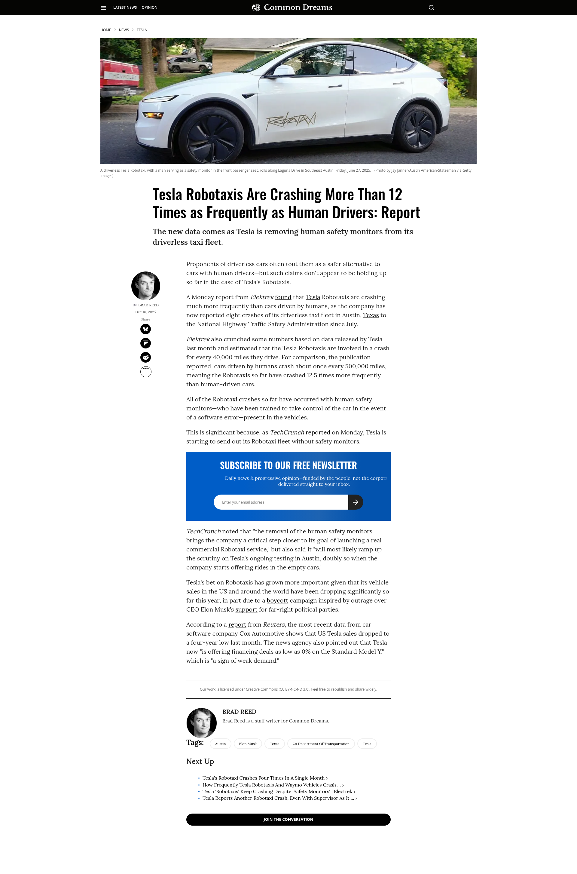 Tesla Robotaxis Are Crashing More Than 12 Times as Frequently as Human Drivers: Report | Common DreamsTesla's Robotaxis are crashing more frequently than human-driven cars, raising safety concerns.PNGPDF
