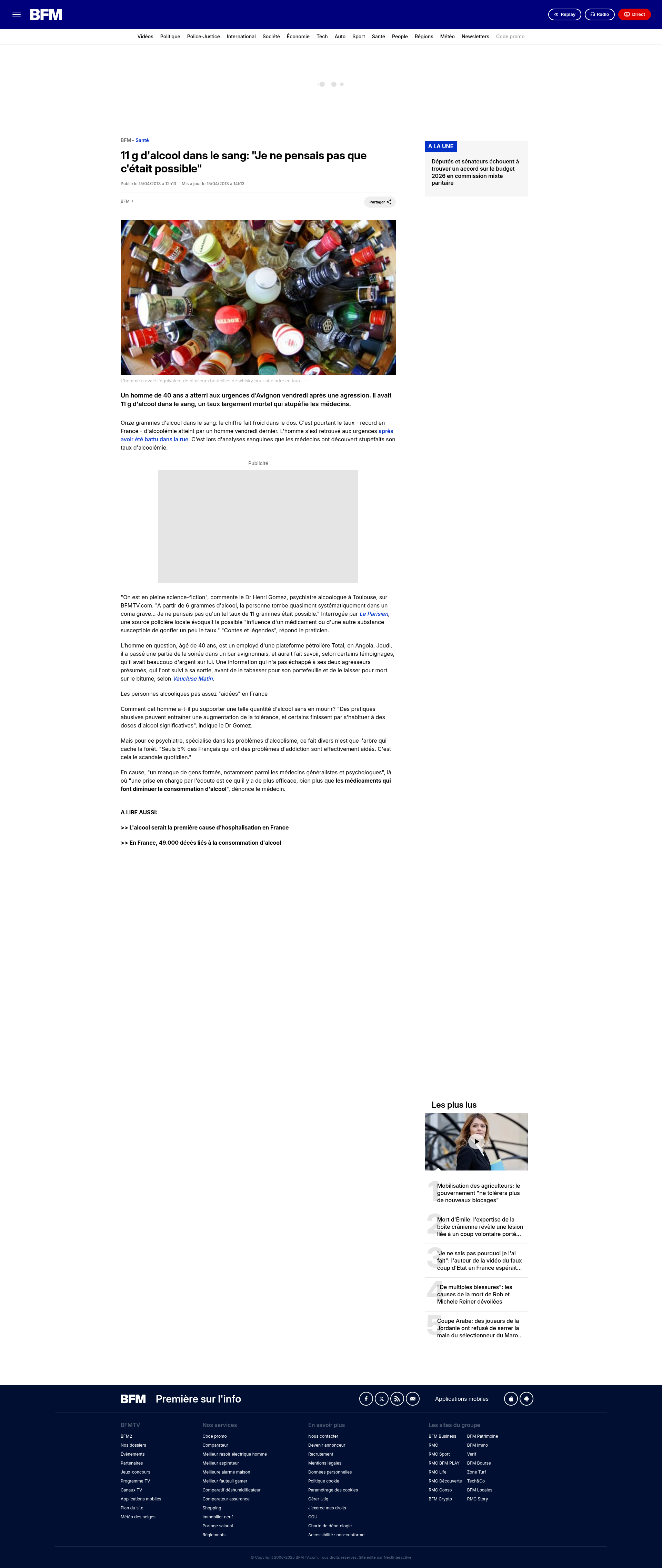 11 g d'alcool dans le sang: "Je ne pensais pas que c'était possible"Un homme de 40 ans a atterri aux urgences d'Avignon vendredi après une agression. Il avait 11 g d'alcool dans le sang, un taux largement mortel qui stupéfie les médecins.PNGPDF