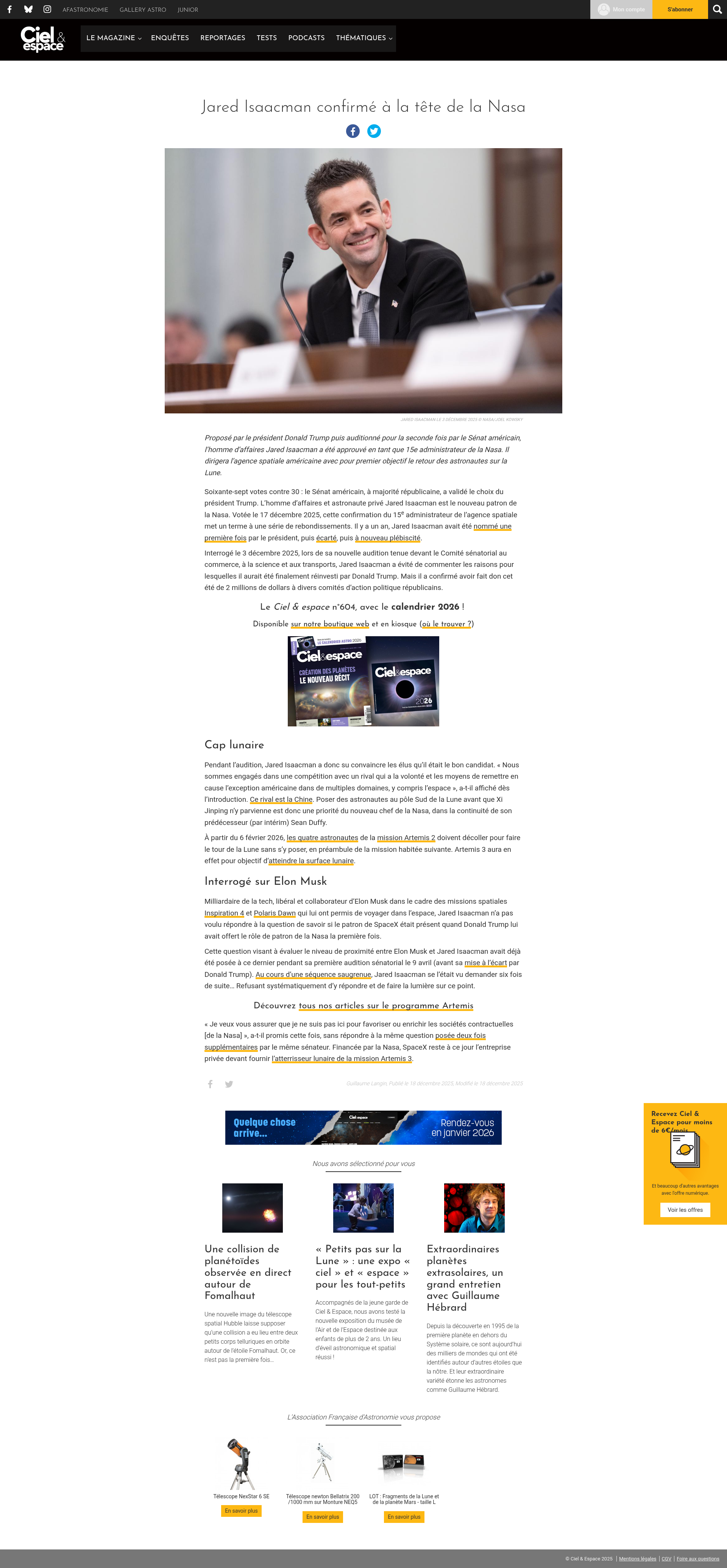 Jared Isaacman confirmé à la tête de la NasaProposé par le président Donald Trump puis auditionné pour la seconde fois par le Sénat américain, l’homme d’affaires Jared Isaacman a été approuvé en tant que 15e administrateur de la Nasa. Il dirigera l’agence spatiale américaine avec pour premier objectif le retour des astronautes sur la Lune.PNGPDF