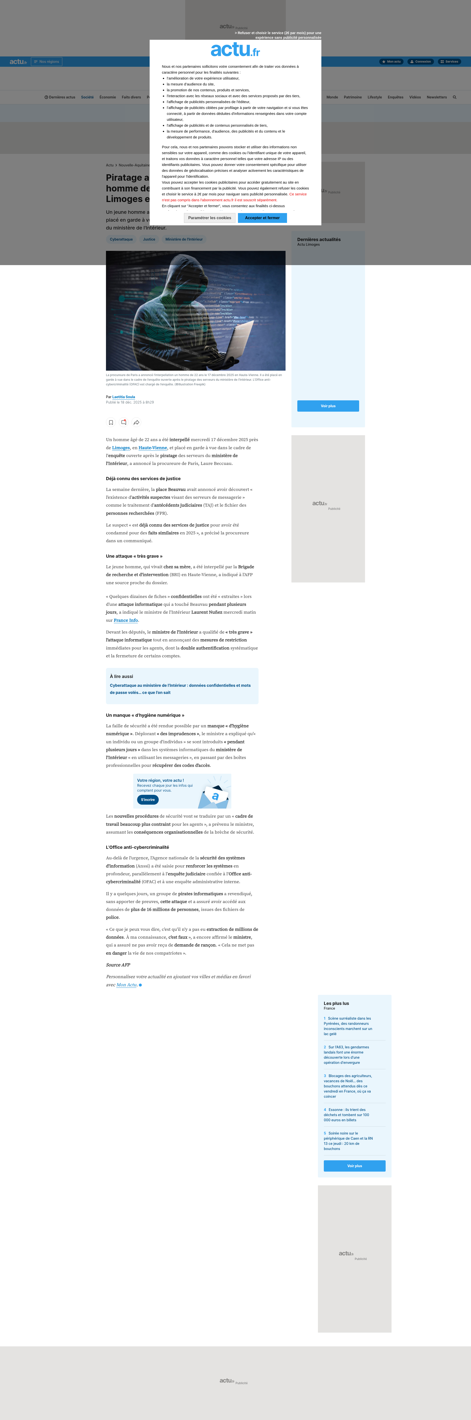 Piratage au ministère de l'Intérieur : un homme de 22 ans interpellé près de Limoges et placé en garde à vueUn jeune homme a été interpellé le 17 décembre 2025 en Haute-Vienne et placé en garde à vue dans le cadre de l'enquête sur le piratage des serveurs du ministère de l'Intérieur.PNGPDF