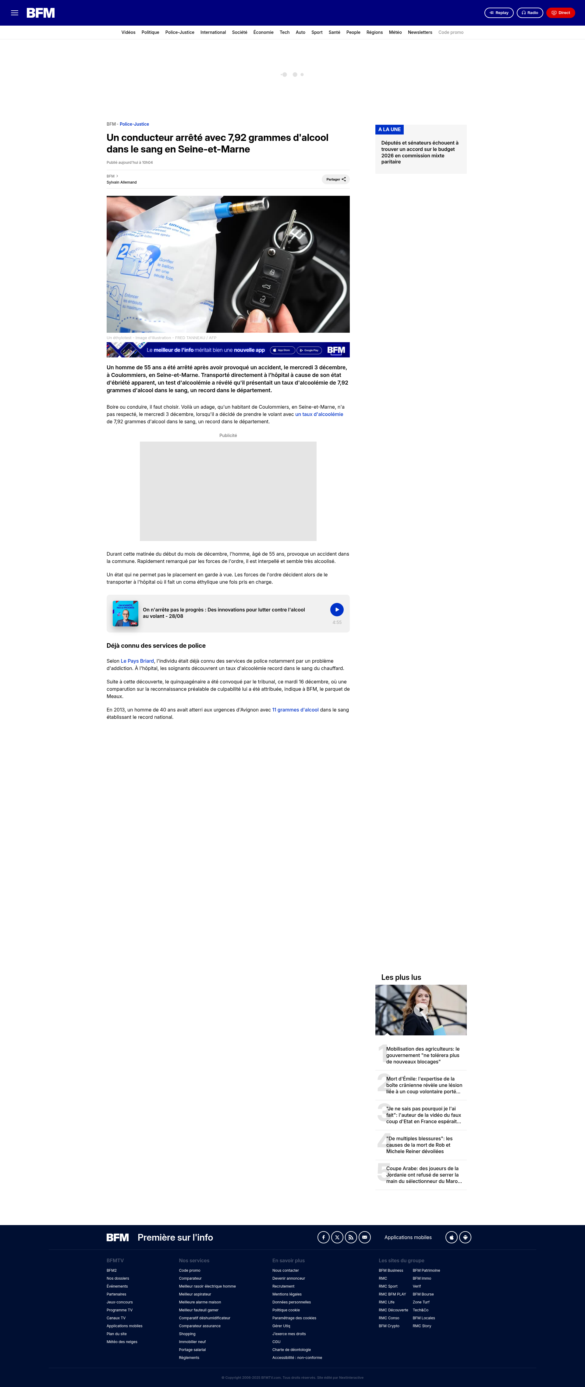 Un conducteur arrêté avec 7,92 grammes d'alcool dans le sang en Seine-et-MarneUn homme de 55 ans a été arrêté après avoir provoqué un accident, le mercredi 3 décembre, à Coulommiers, en Seine-et-Marne. Transporté directement à l’hôpital à cause de son état d'ébriété apparent, un test d'alcoolémie a révélé qu'il présentait un taux d'alcoolémie de 7,92 grammes d'alcool dans le...PNGPDF