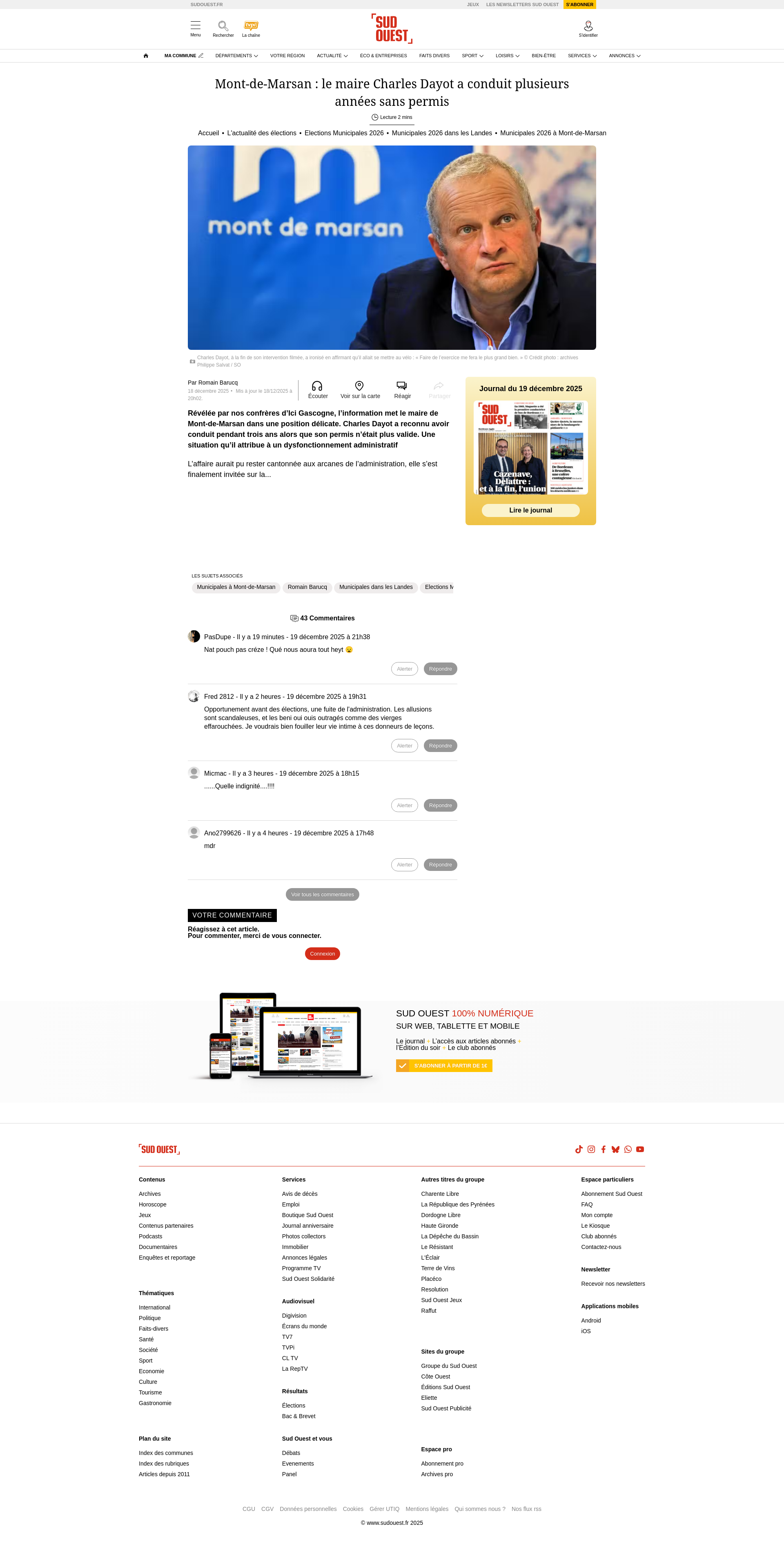 Mont-de-Marsan : le maire Charles Dayot a conduit plusieurs années sans permisRévélée par nos confrères d’Ici Gascogne, l’information met le maire de Mont-de-Marsan dans une position délicate. Charles Dayot a reconnu avoir conduit pendant trois ans alors que son permis n’était plus valide. Une situation qu’il attribue à un dysfonctionnement administratifPNGPDF