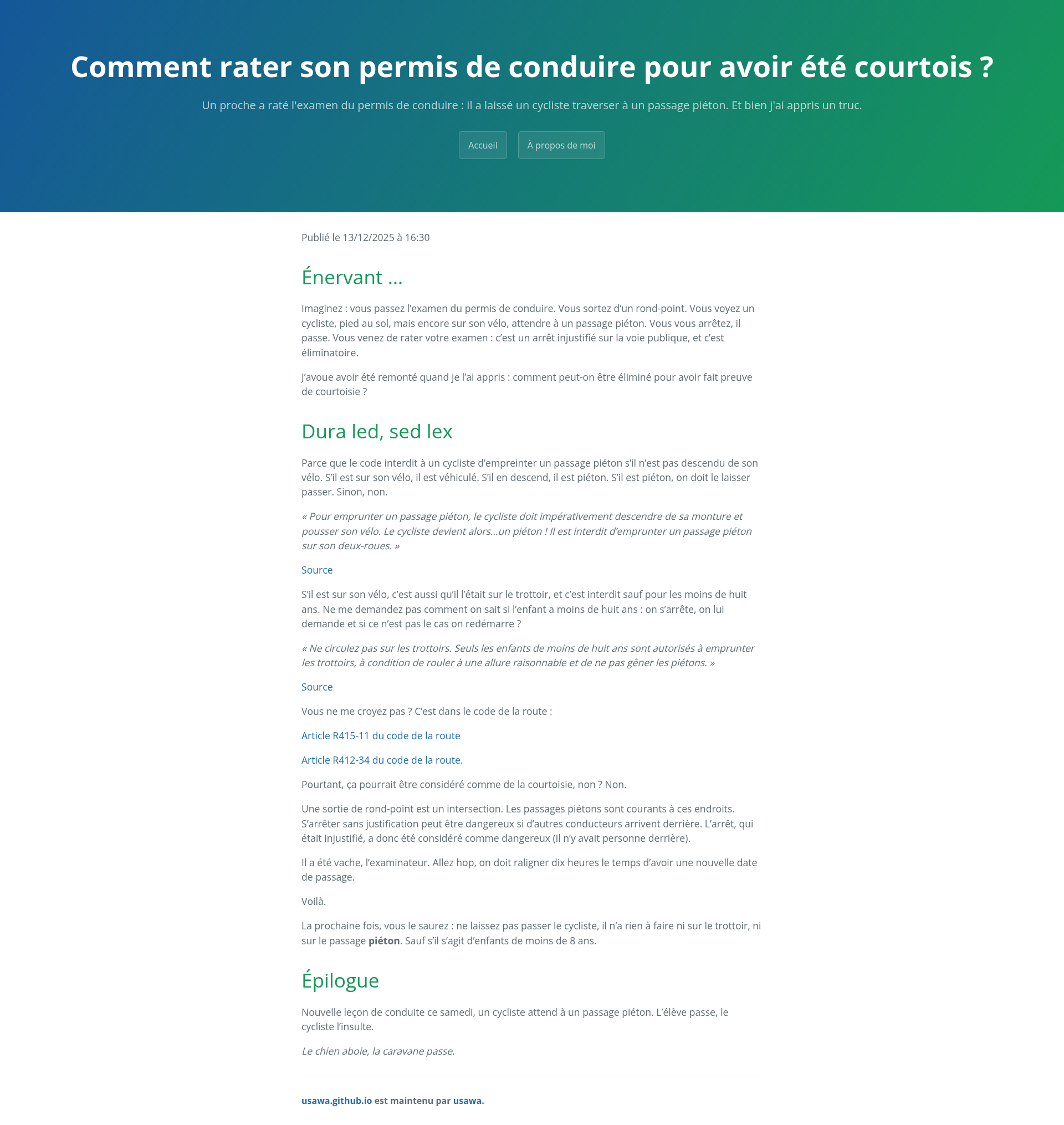 Comment rater son permis de conduire pour avoir été courtois ?Un proche a raté l’examen du permis de conduire : il a laissé un cycliste traverser à un passage piéton. Et bien j’ai appris un truc.PNGPDF