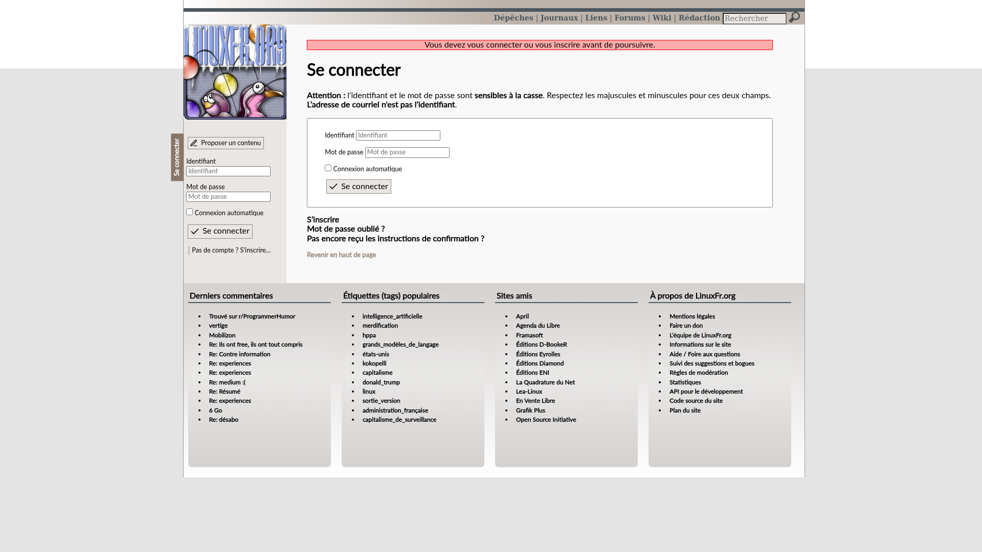 LinuxFr.orgL’actualité du logiciel libre et des sujets voisins (DIY, Open Hardware, Open Data, les Communs, etc.), sur un site francophone contributif géré par une équipe bénévole par et pour des libristes enthousiastesPNGPDF
