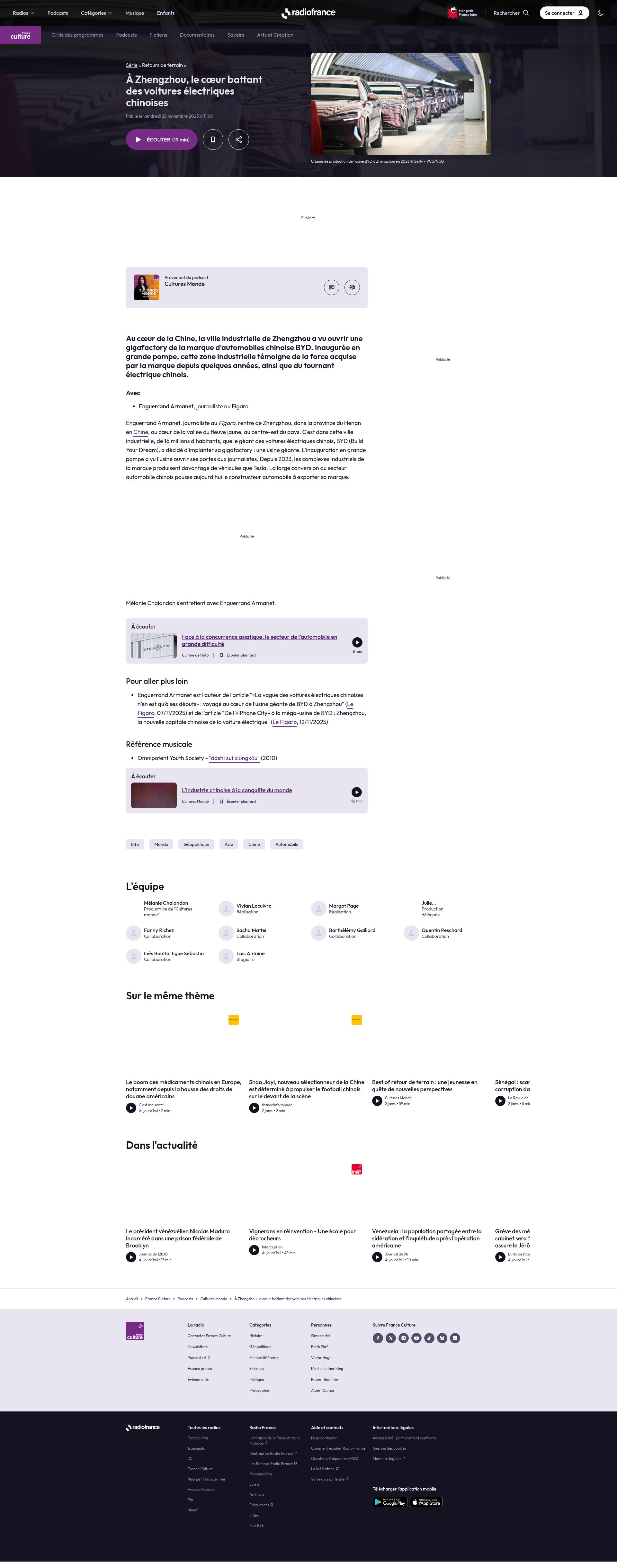 À Zhengzhou, le cœur battant des voitures électriques chinoises : épisode du podcast Retours de terrainAUDIO • Retours de terrain, épisode : À Zhengzhou, le cœur battant des voitures électriques chinoises. Une série inédite proposée par France Culture. Écoutez Cultures Monde, et découvrez nos podcasts en ligne.PNGPDF