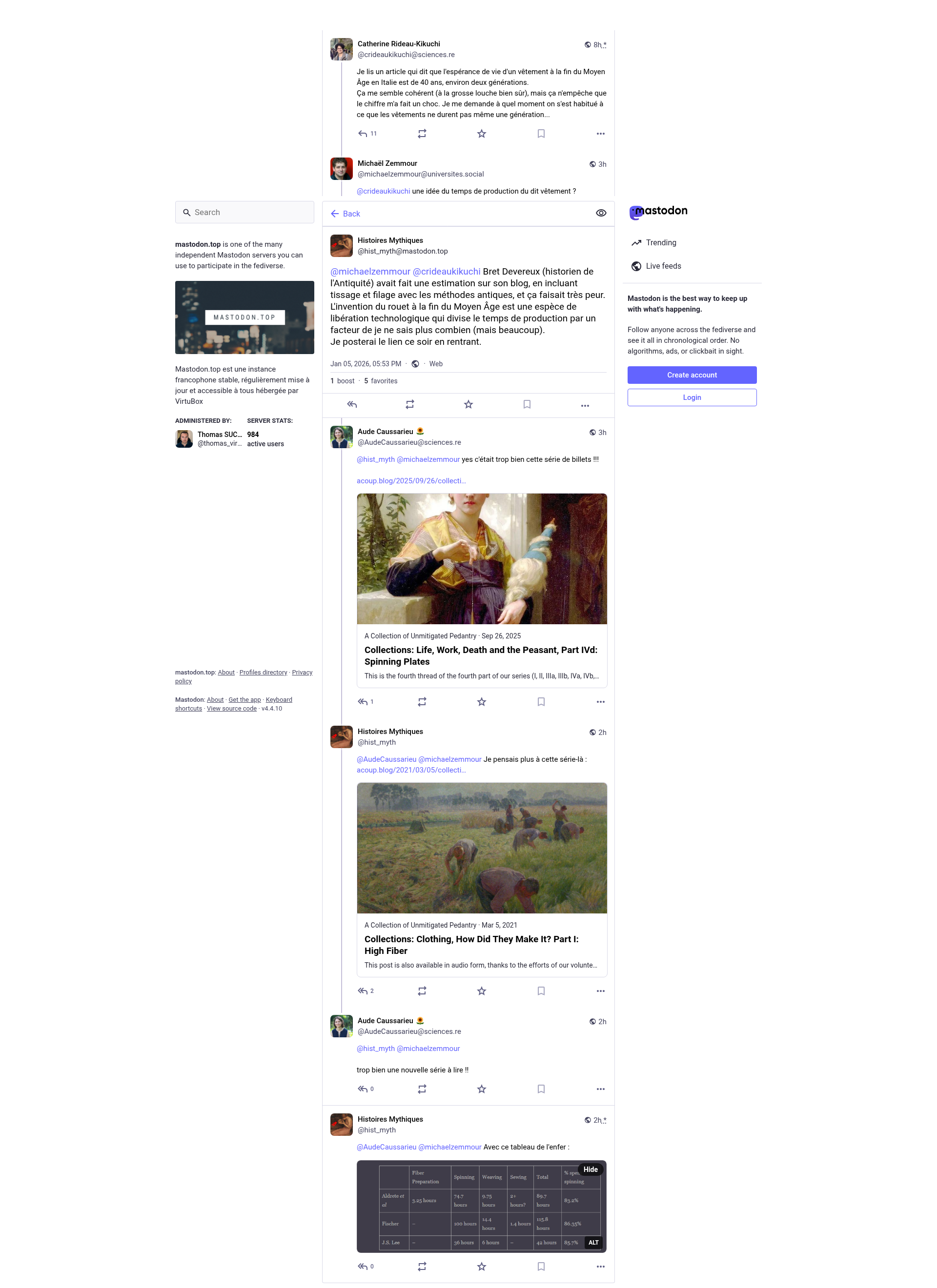 Histoires Mythiques (@hist_myth@mastodon.top)@michaelzemmour@universites.social @crideaukikuchi@sciences.re Bret Devereux (historien de l'Antiquité) avait fait une estimation sur son blog, en incluant tissage et filage avec les méthodes antiques, et ça faisait très peur. L'invention du rouet à la fin du Moyen Âge est une espèce de libération technologique qui divise le temps de production par un facteur de je ne sais plus combien (mais beaucoup). Je posterai le lien ce soir en rentrant.PNGPDF
